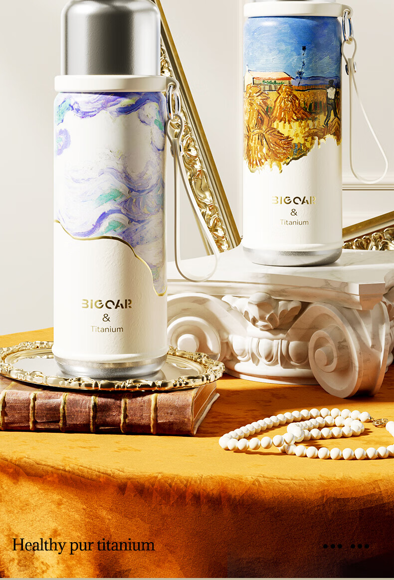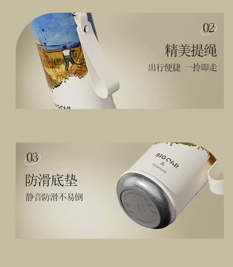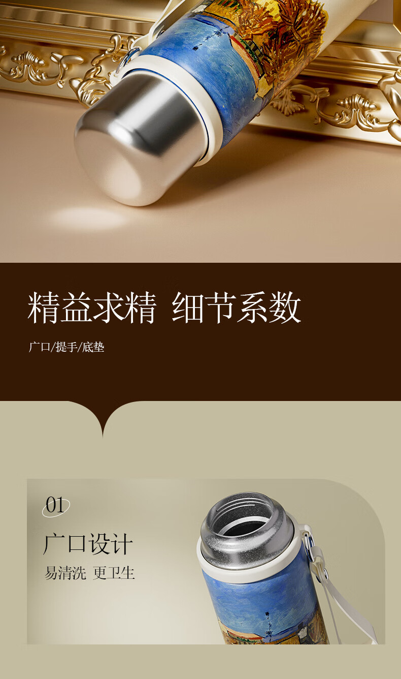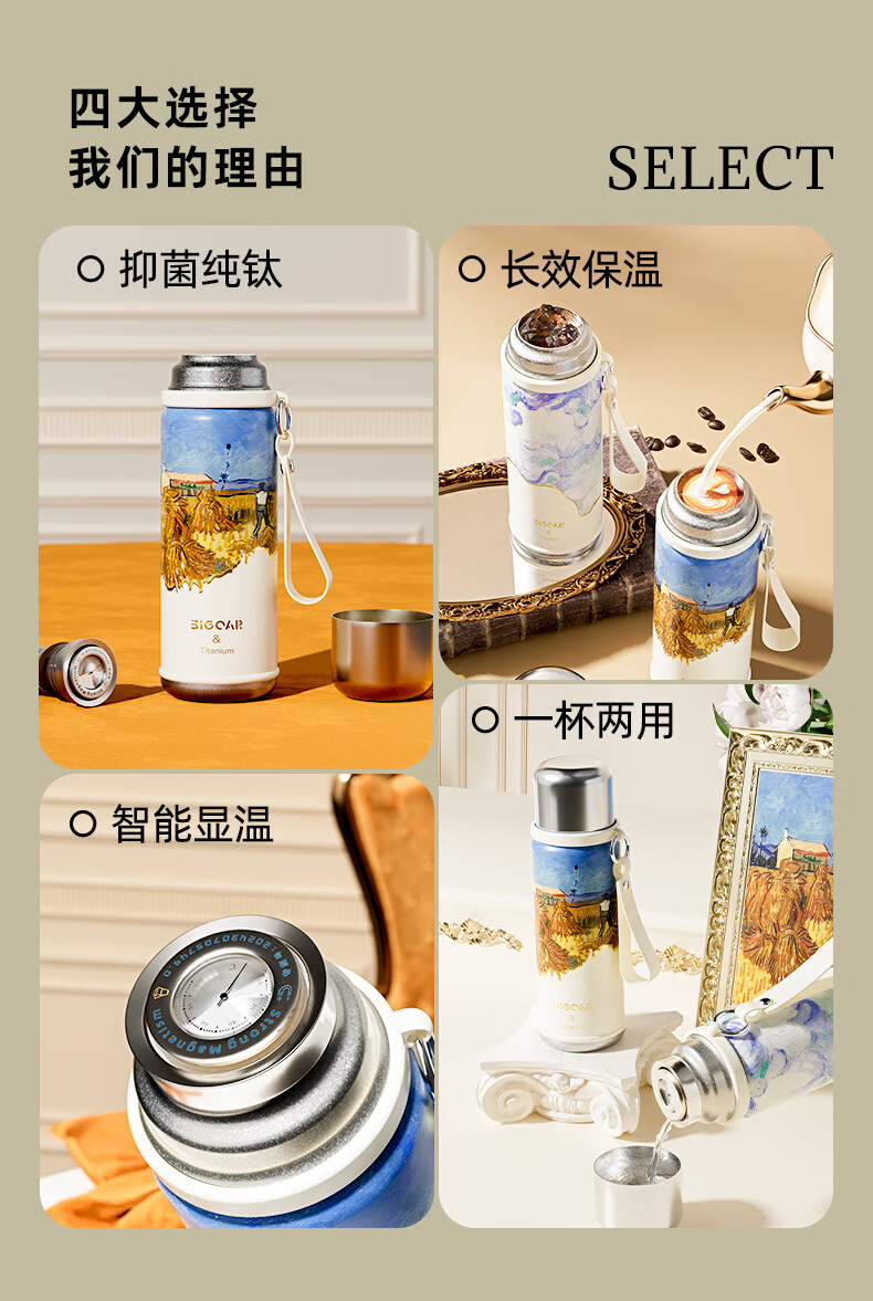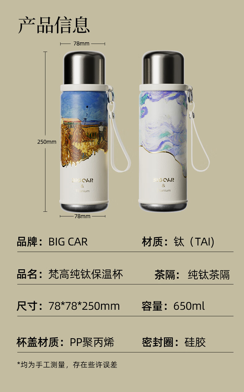 大卡纯钛保温杯大容量商务闷茶杯送礼男女高颜值便携智能温显办公水杯 梵高云朵650ml【智能显温+礼盒】