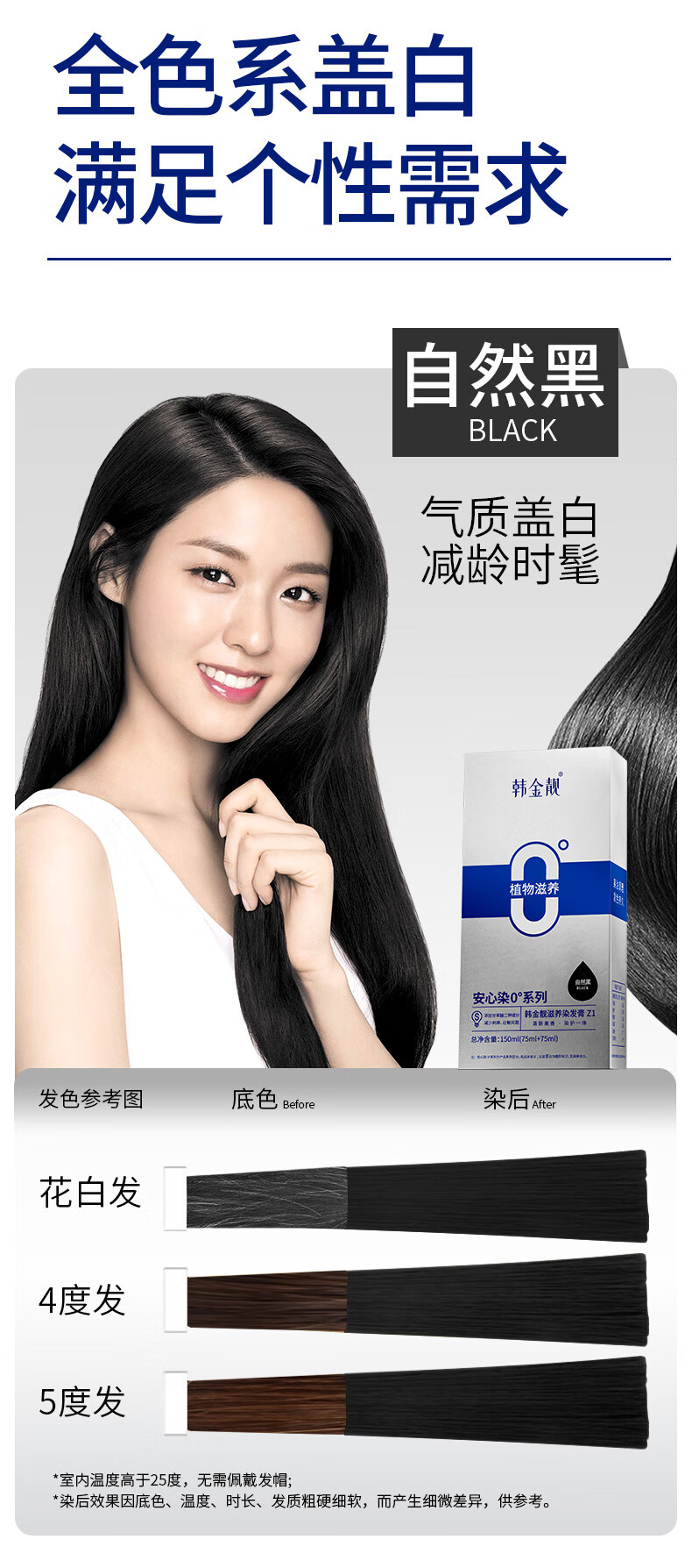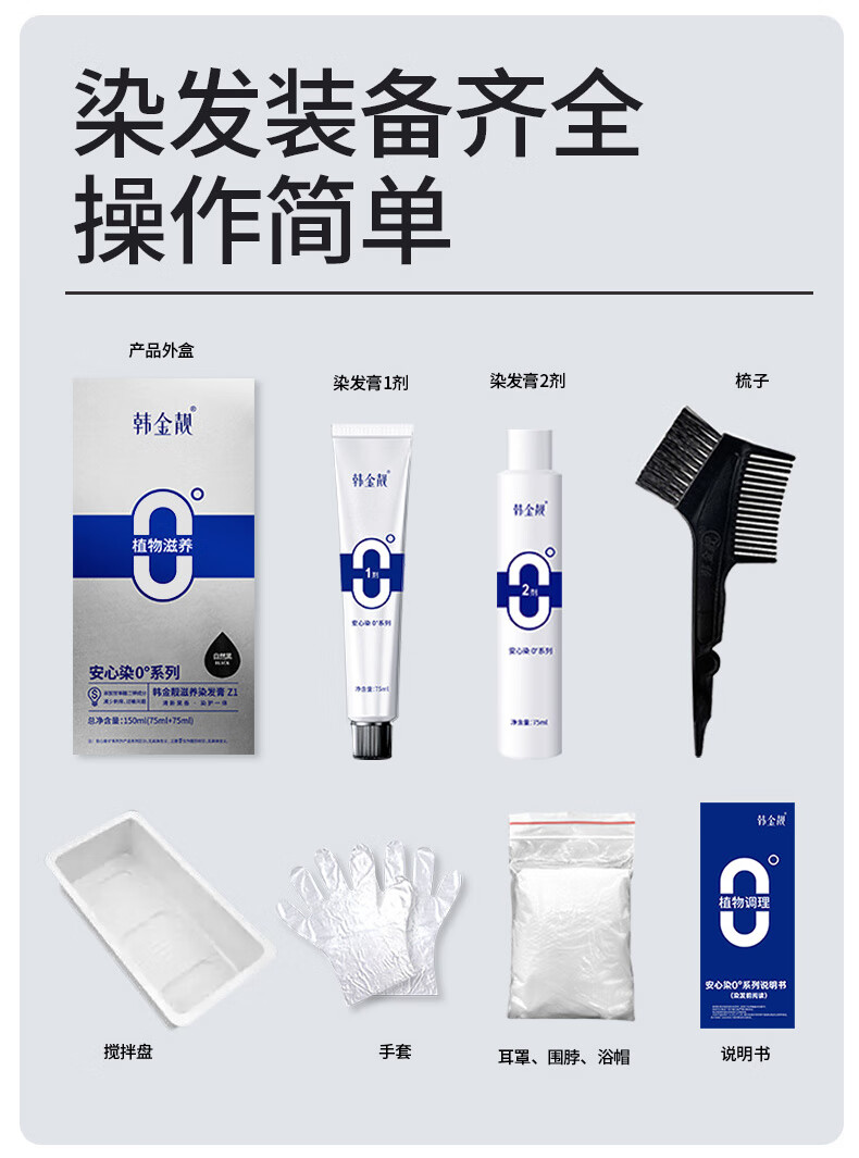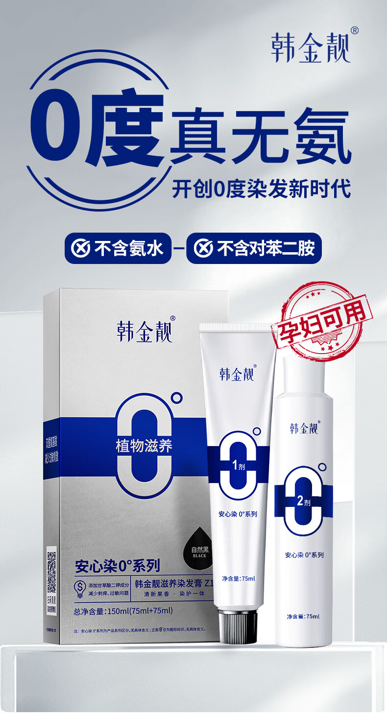 韩金靓无氨染发膏孕妇可用自己在家染男女不伤头皮植物染发剂遮盖白发 自然黑 150ml*1盒