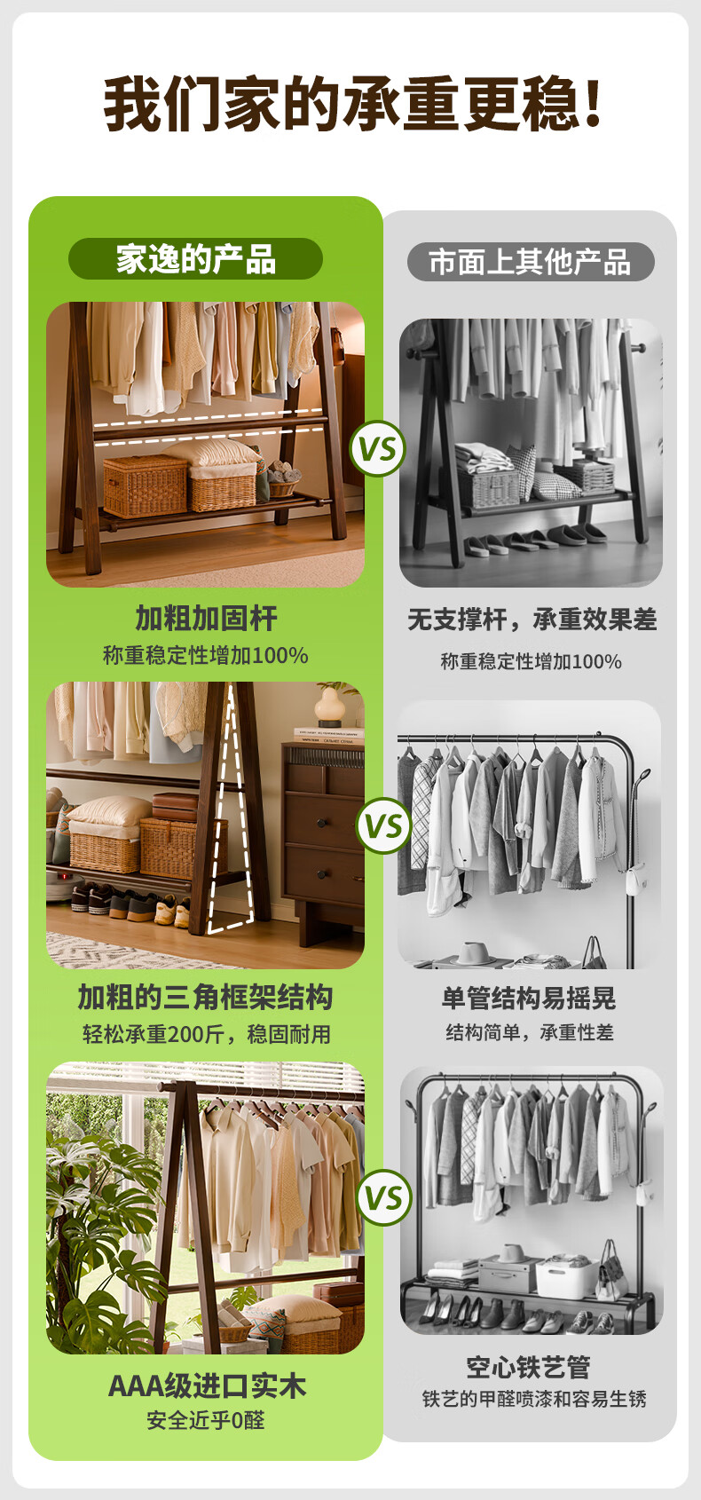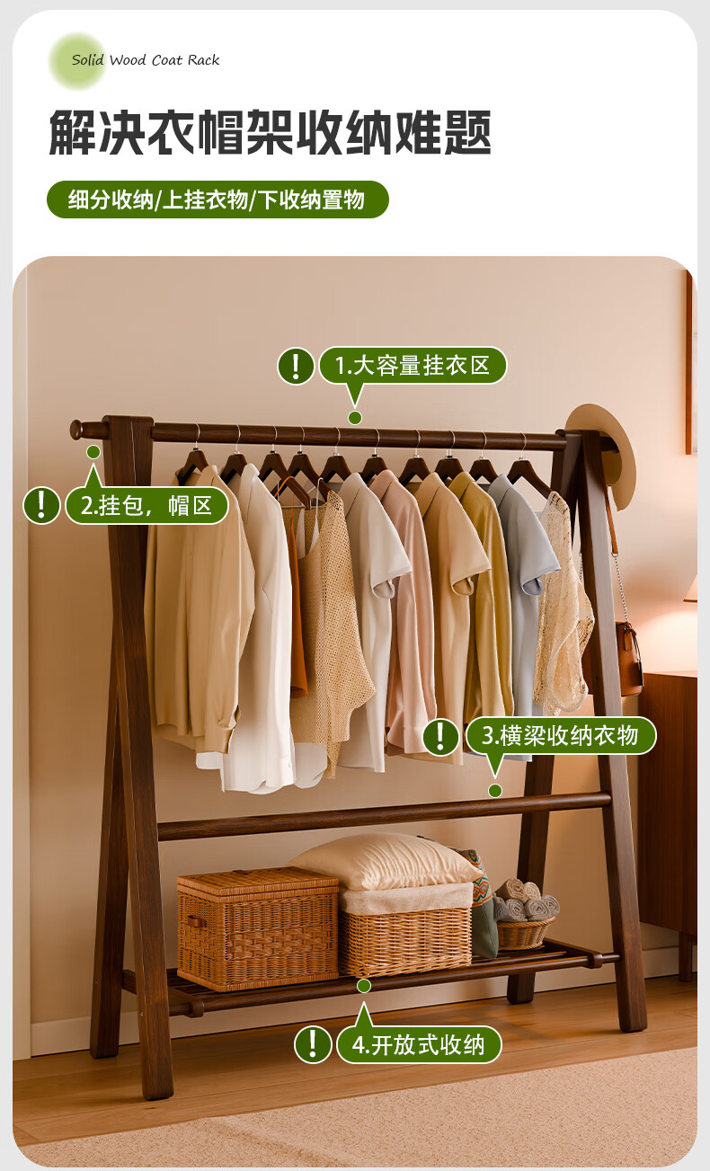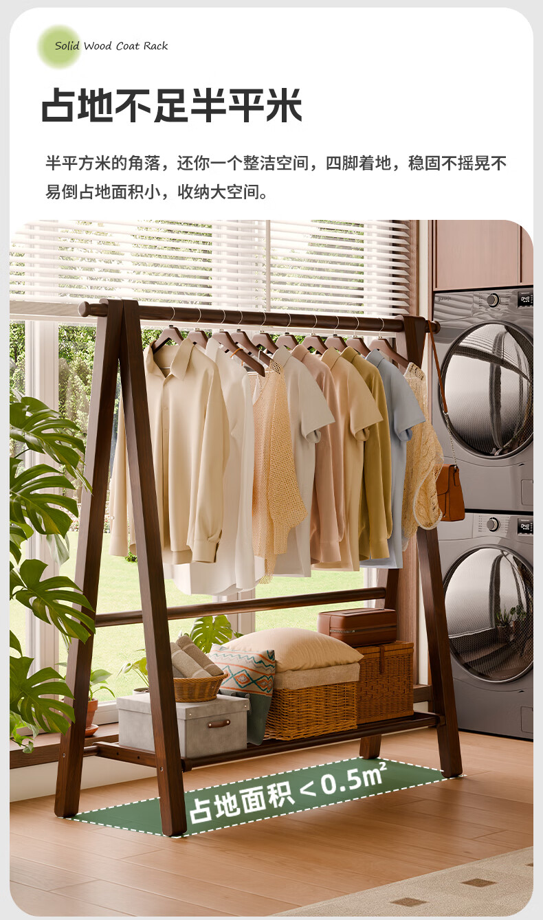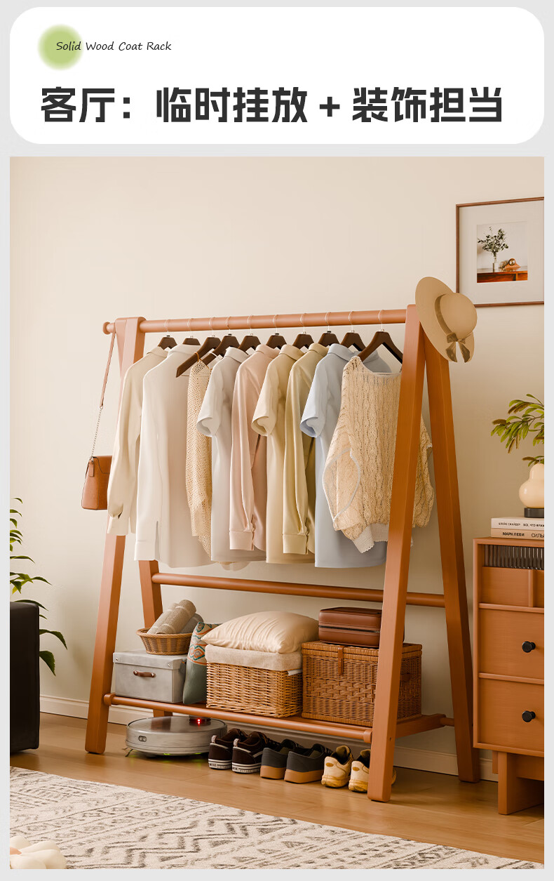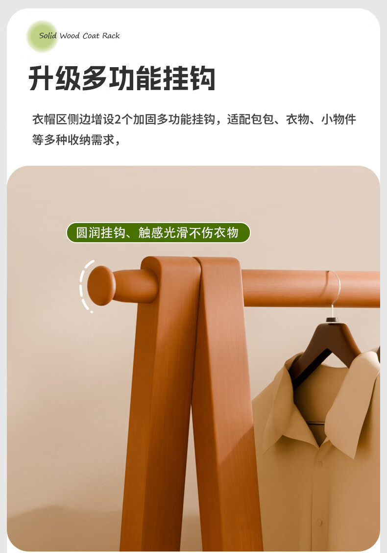 家逸衣架落地实木衣帽架卧室挂衣架可折叠衣架挂衣服架子门口置物架