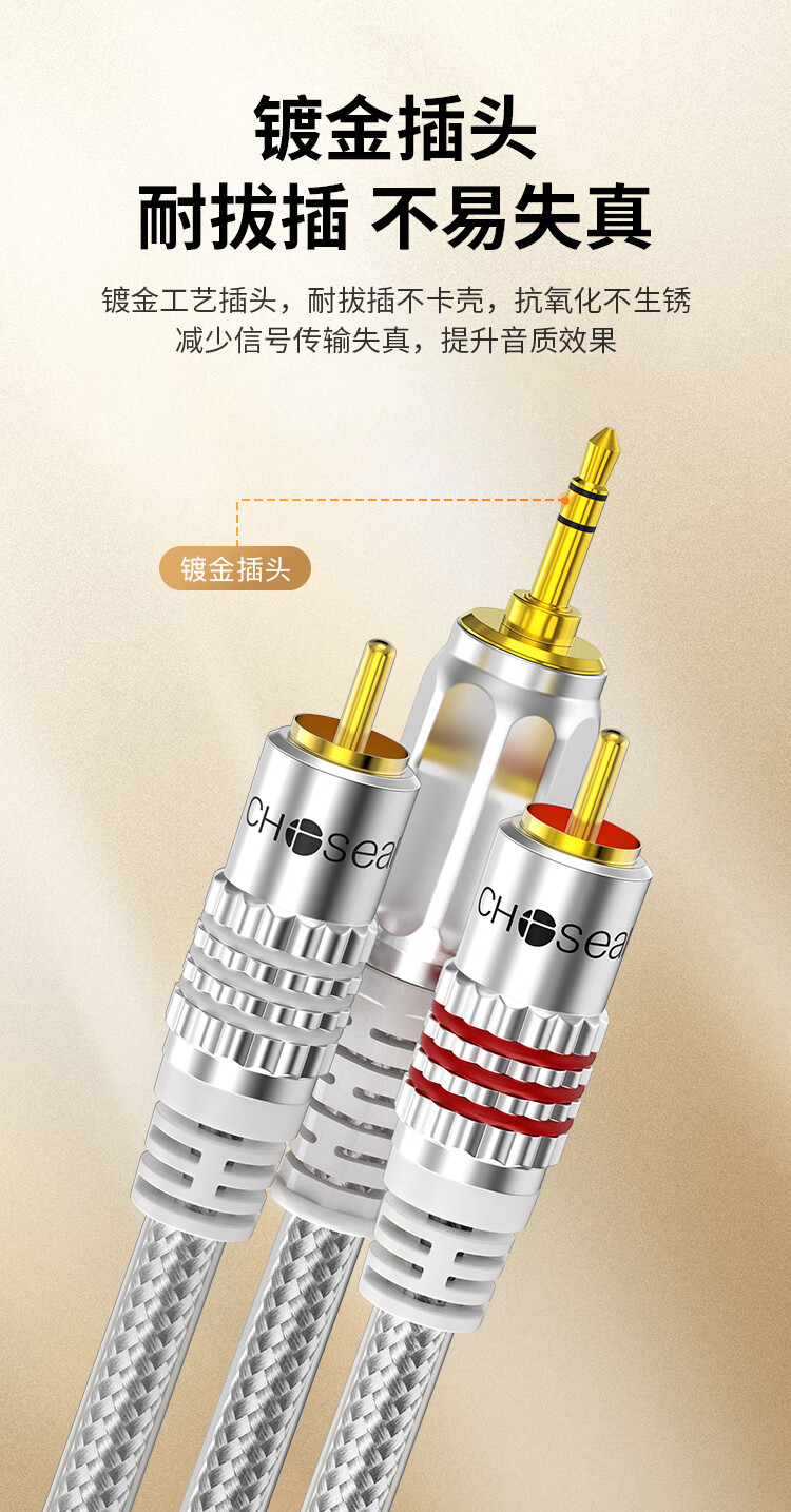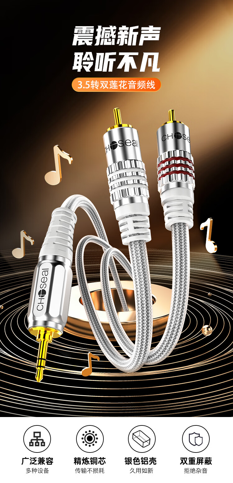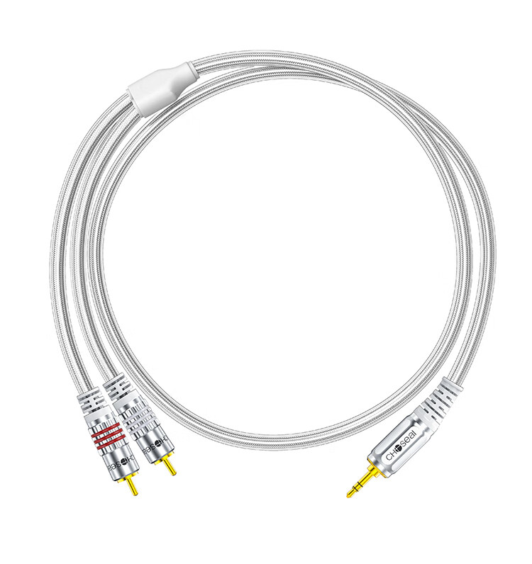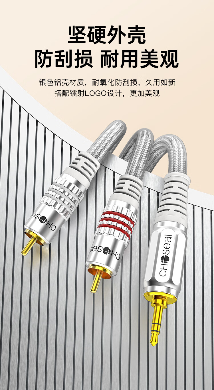 秋叶原(CHOSEAL)3.5mm转双莲花音频线 双层屏蔽银亮铝壳 一分二红白2RCA公对公 手机电脑音响转接线 8米 QS6776