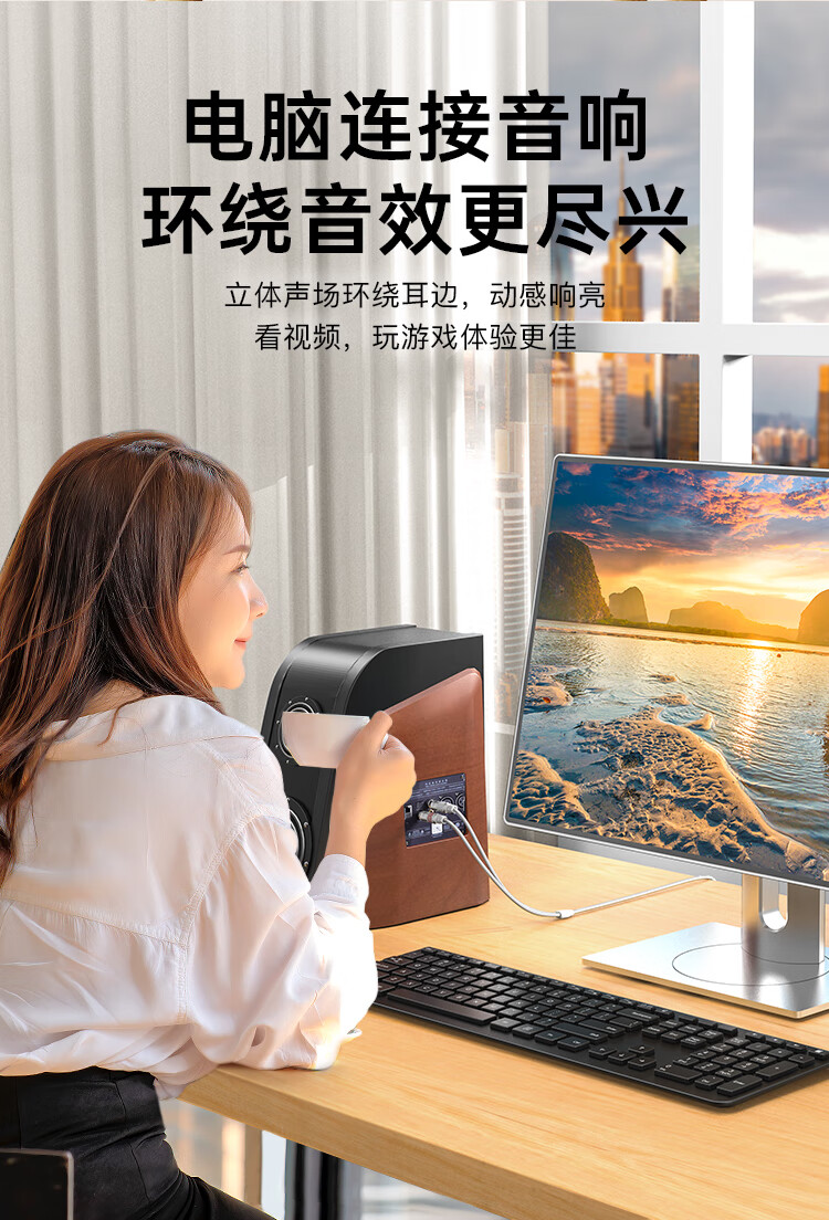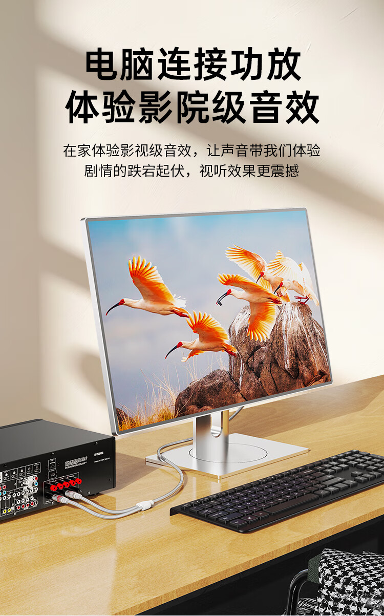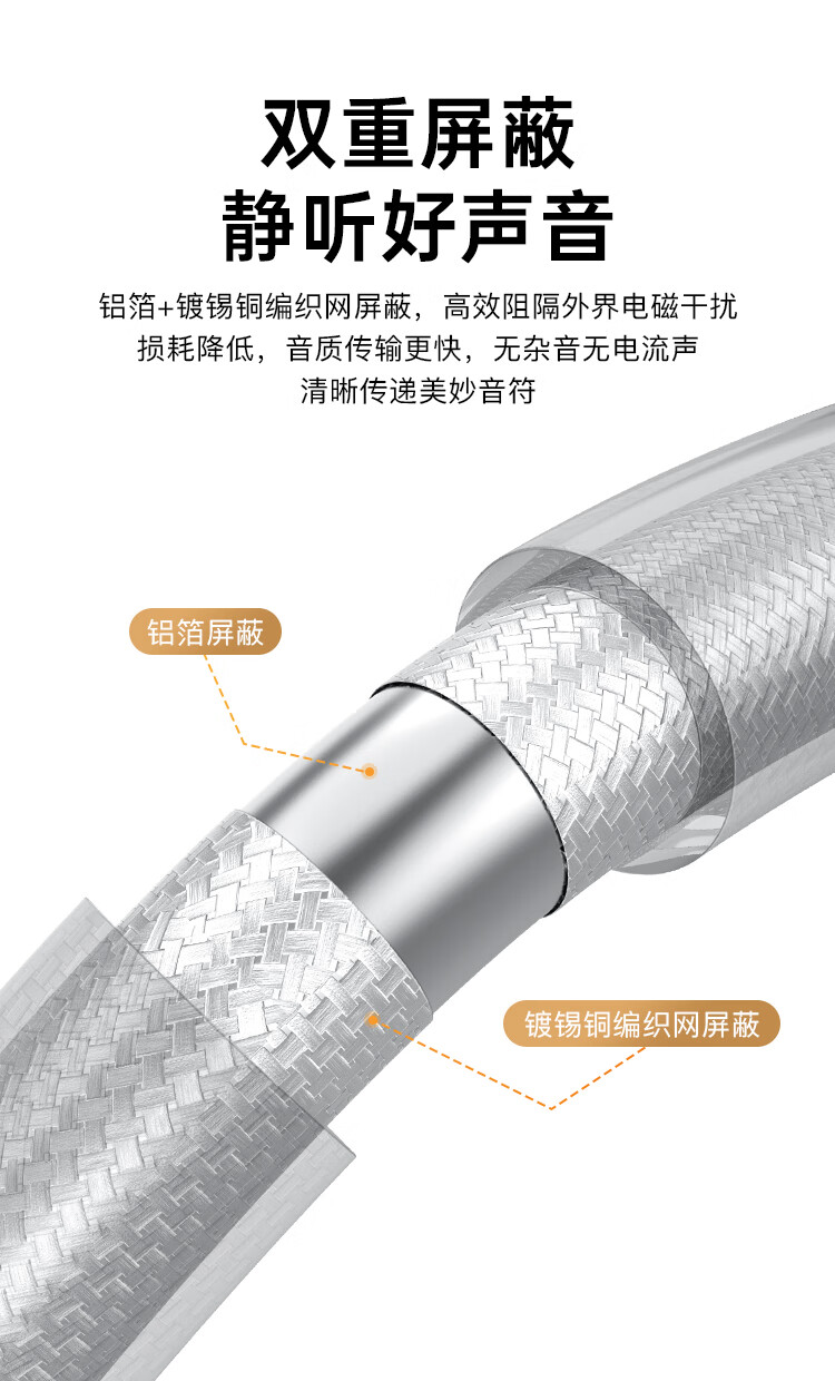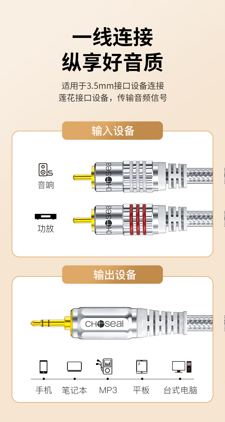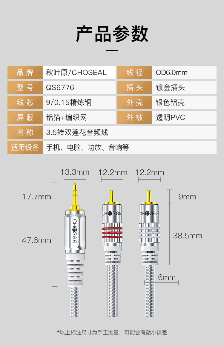 秋叶原(CHOSEAL)3.5mm转双莲花音频线 双层屏蔽银亮铝壳 一分二红白2RCA公对公 手机电脑音响转接线 8米 QS6776