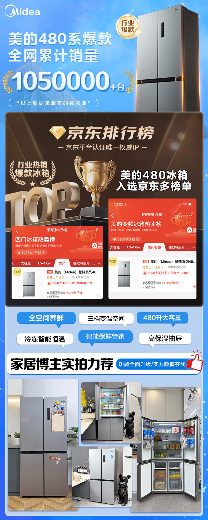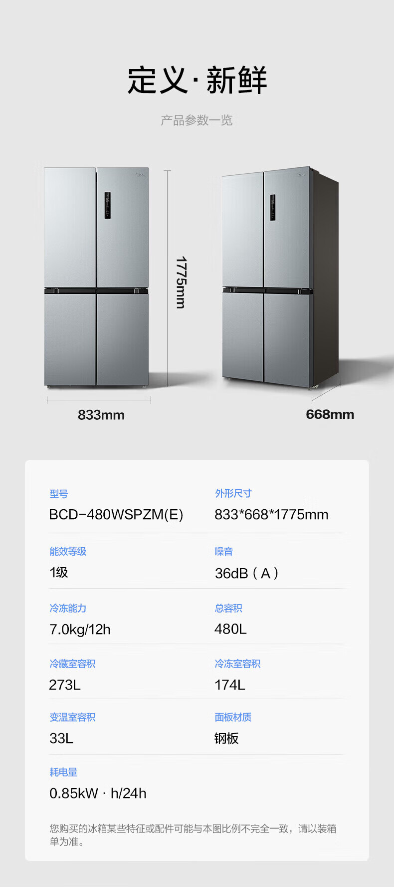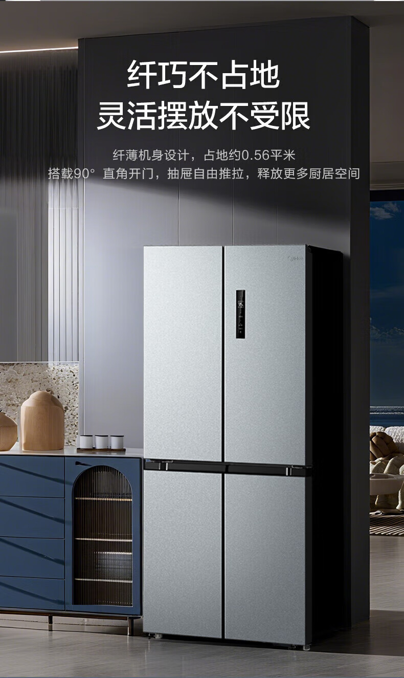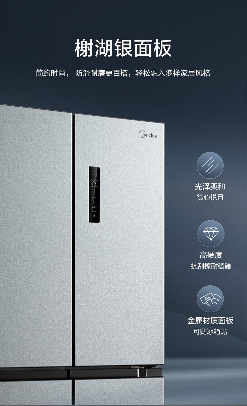 美的(Midea)慧鲜系列480升十字双对开四门冰箱 一级能效节能省电 风冷无霜大容量全空间保鲜 BCD-480WSPZM(E) 榭湖银