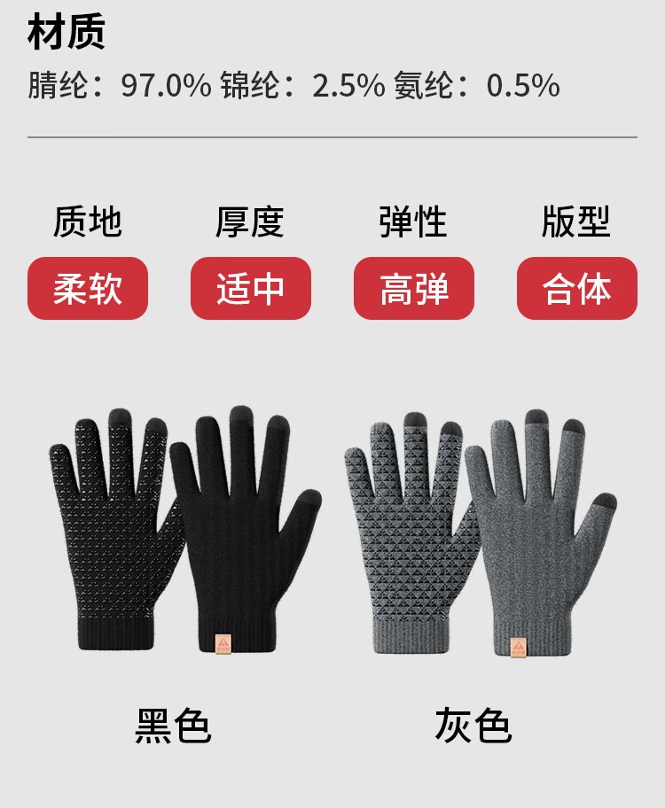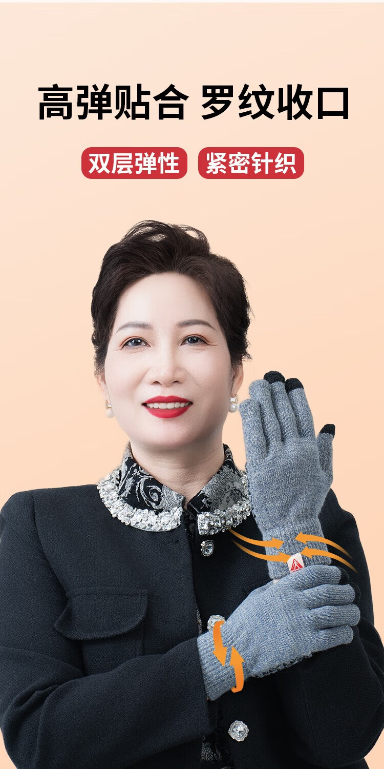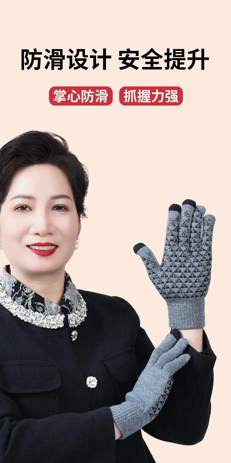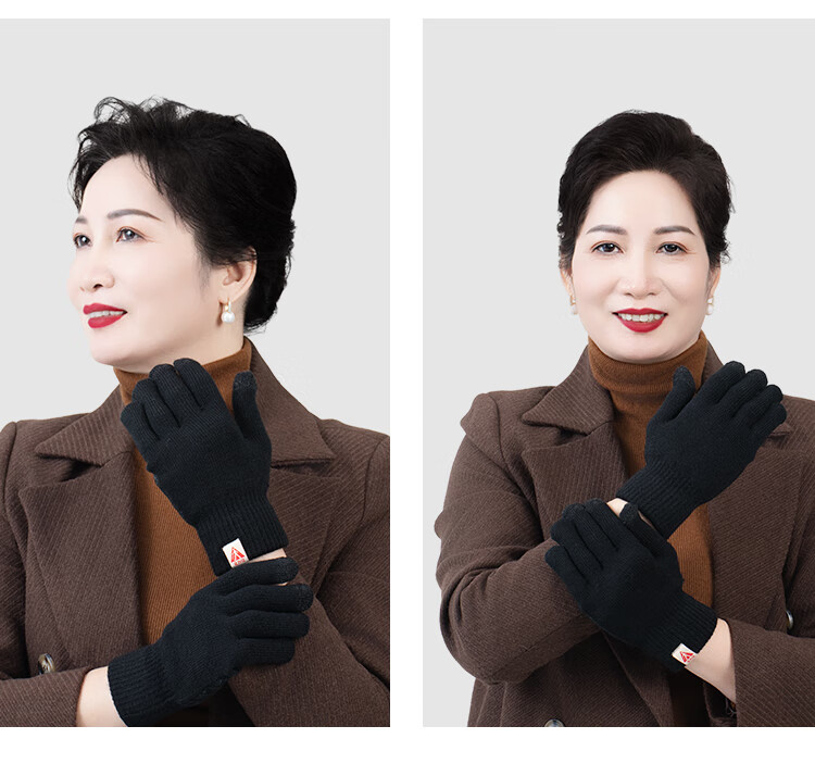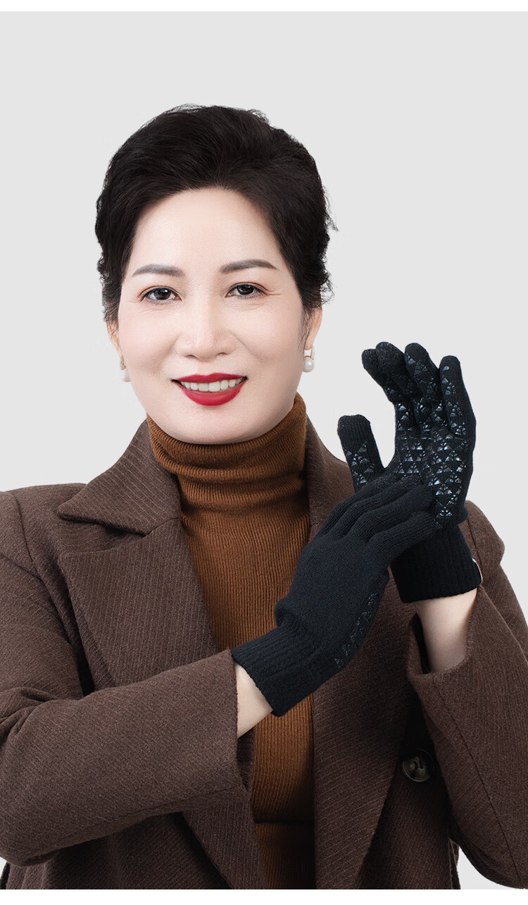 足力健骑行手套女秋冬加绒中老年保暖防风防滑可触屏弹力针织户外 黑色 均码 1双