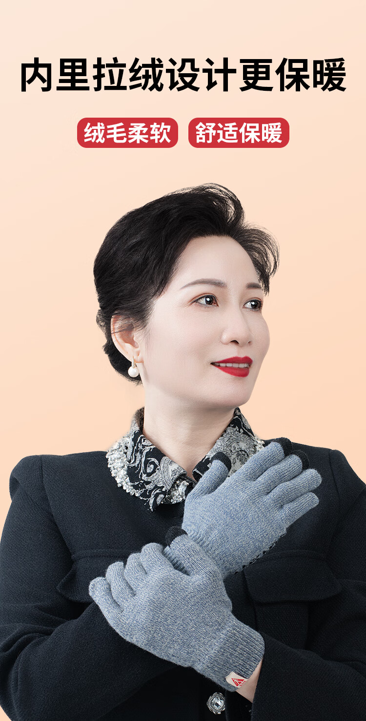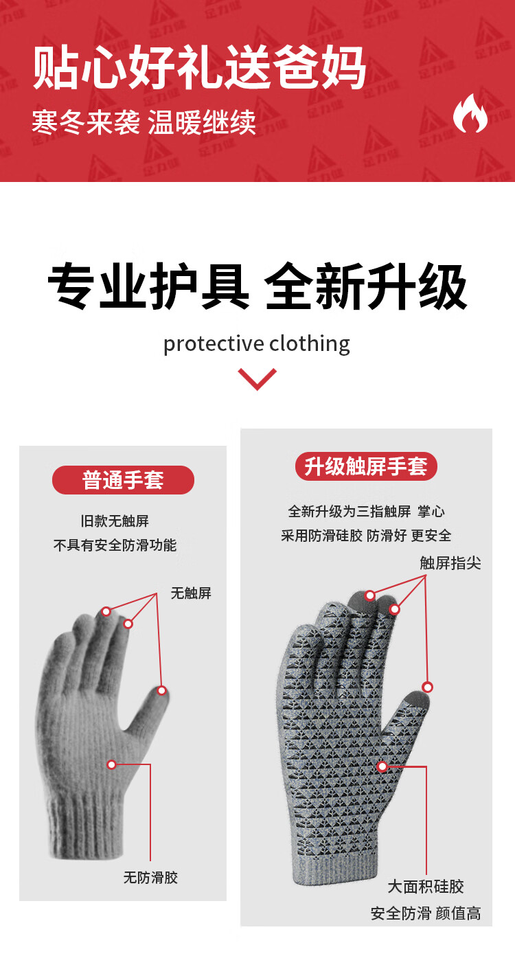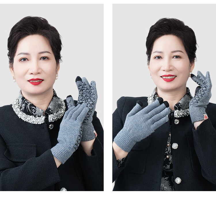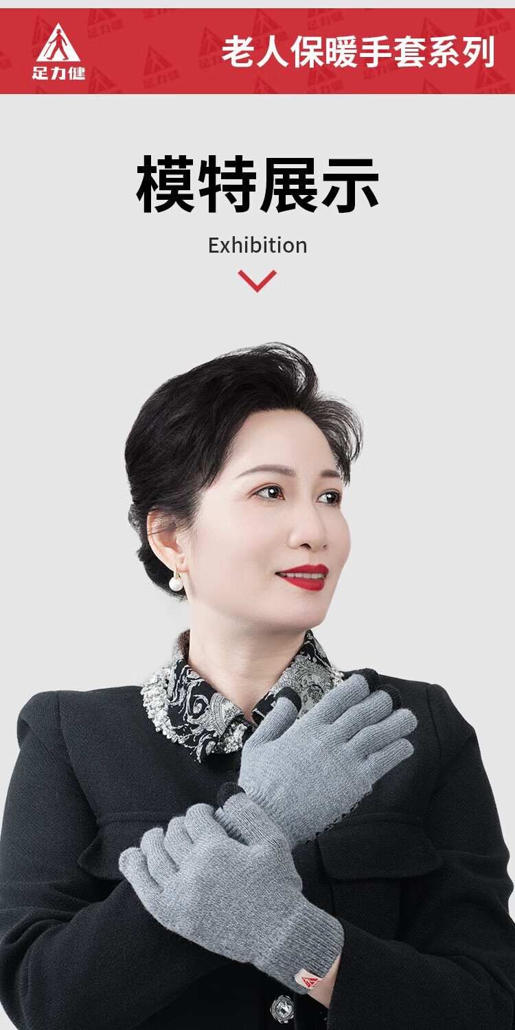 足力健骑行手套女秋冬加绒中老年保暖防风防滑可触屏弹力针织户外 黑色 均码 1双