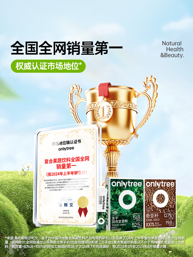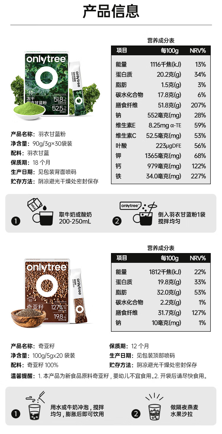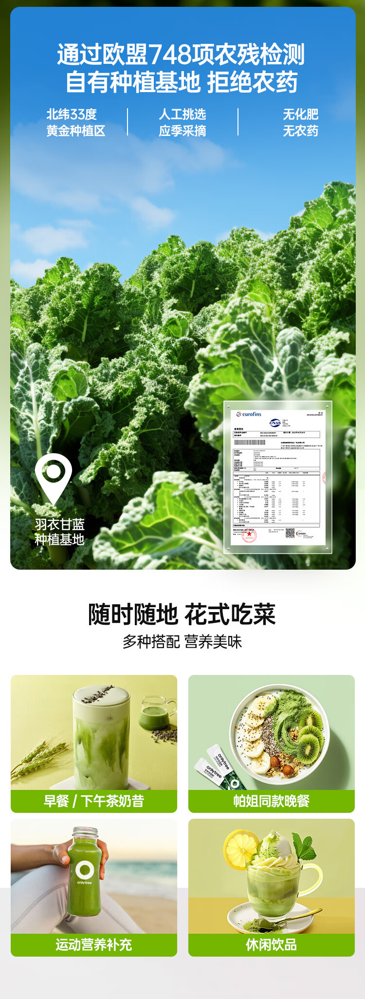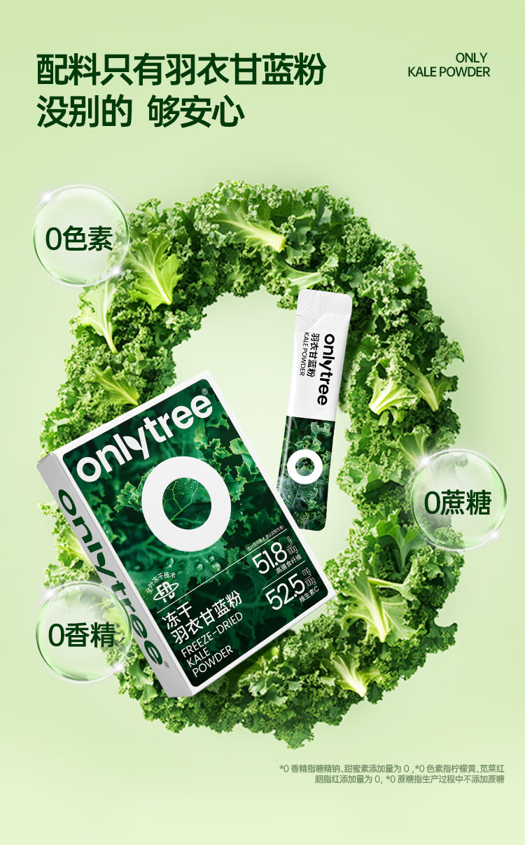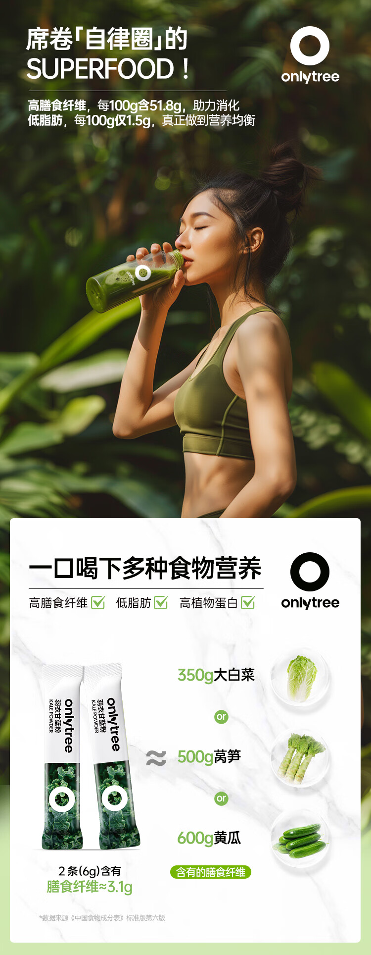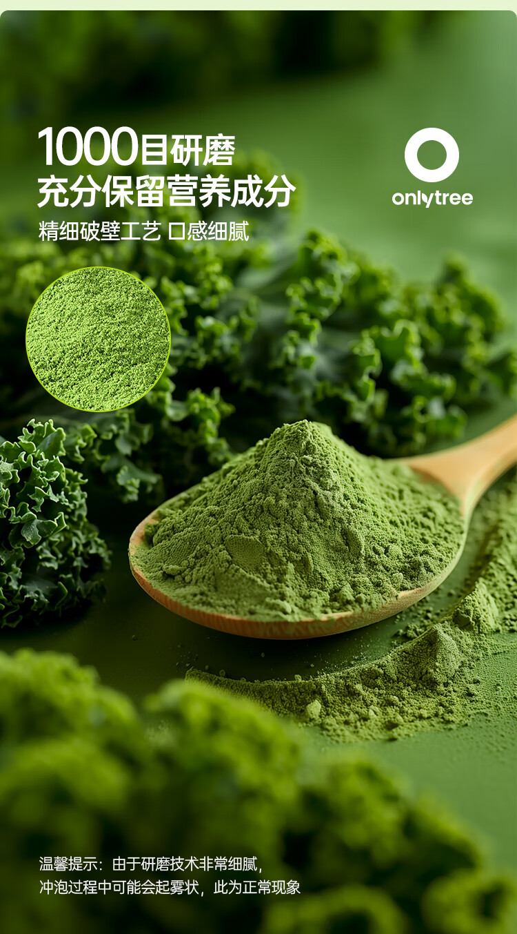 ONLYTREE纯冻干羽衣甘蓝粉奇亚籽膳食纤维蔬菜粉冲饮代餐粉2盒50袋共190g