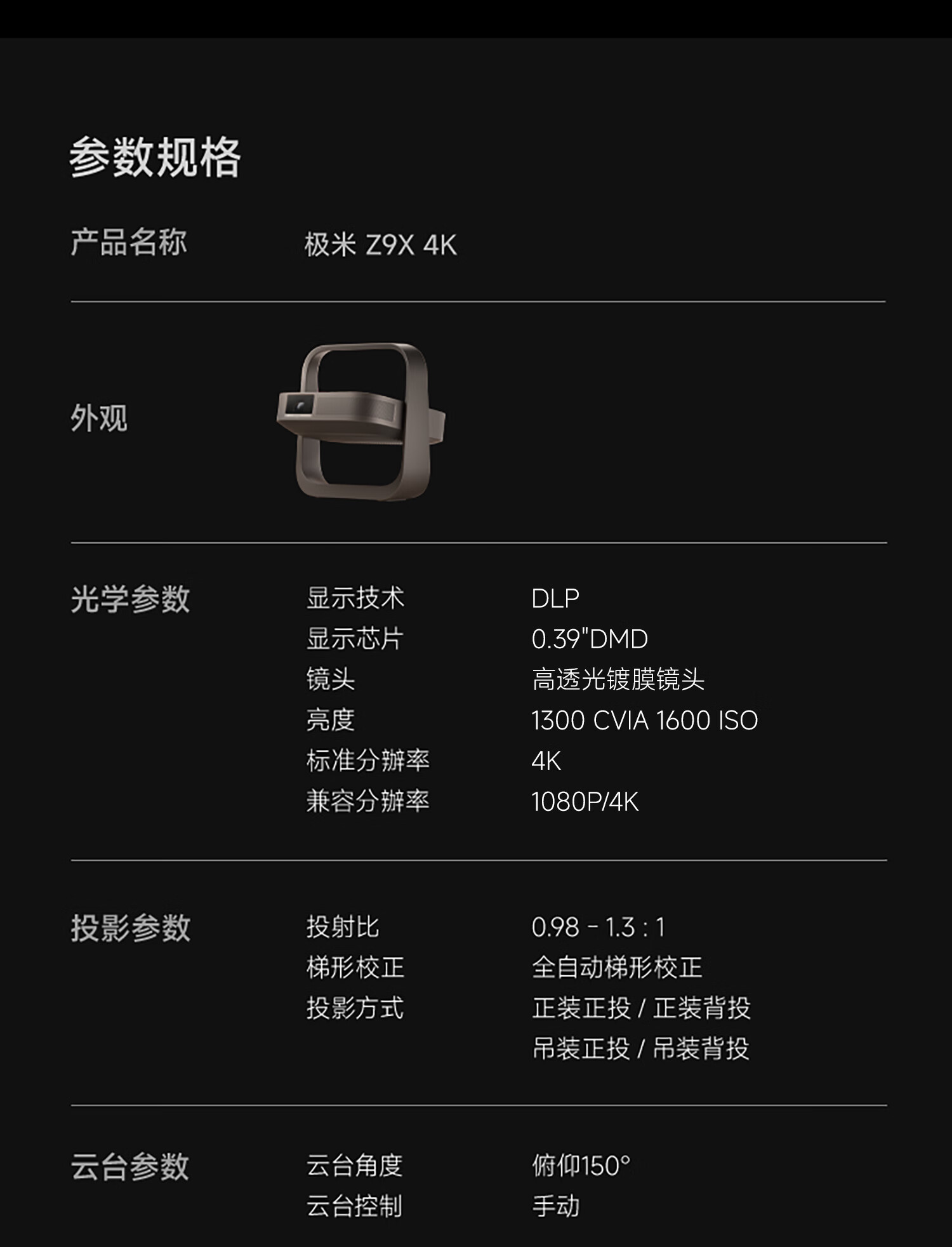 极米Z9X 4K 全新轻薄4K光学变焦投影 1300CVIA真实高亮 家用智能投影仪高清家庭影院云台 国家补贴