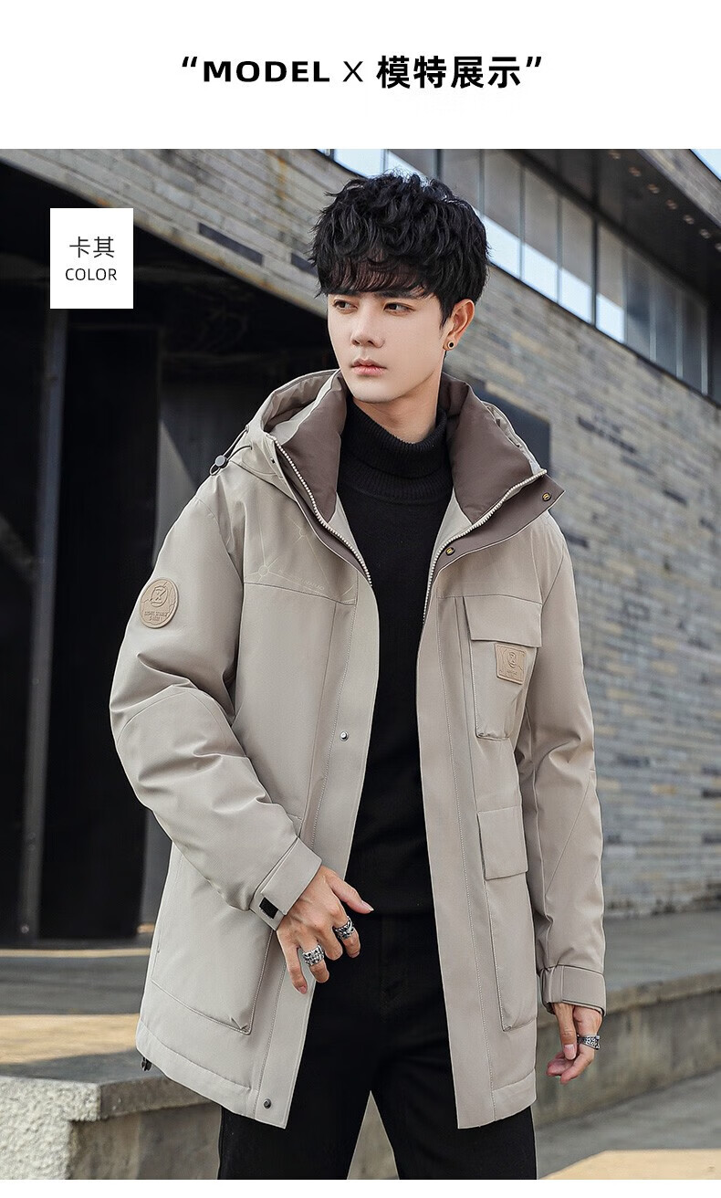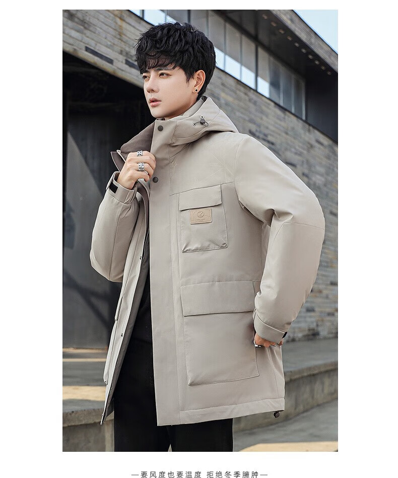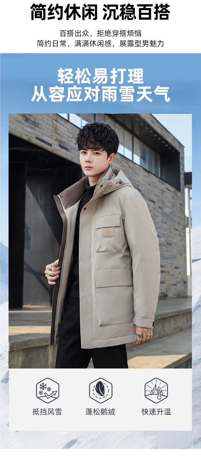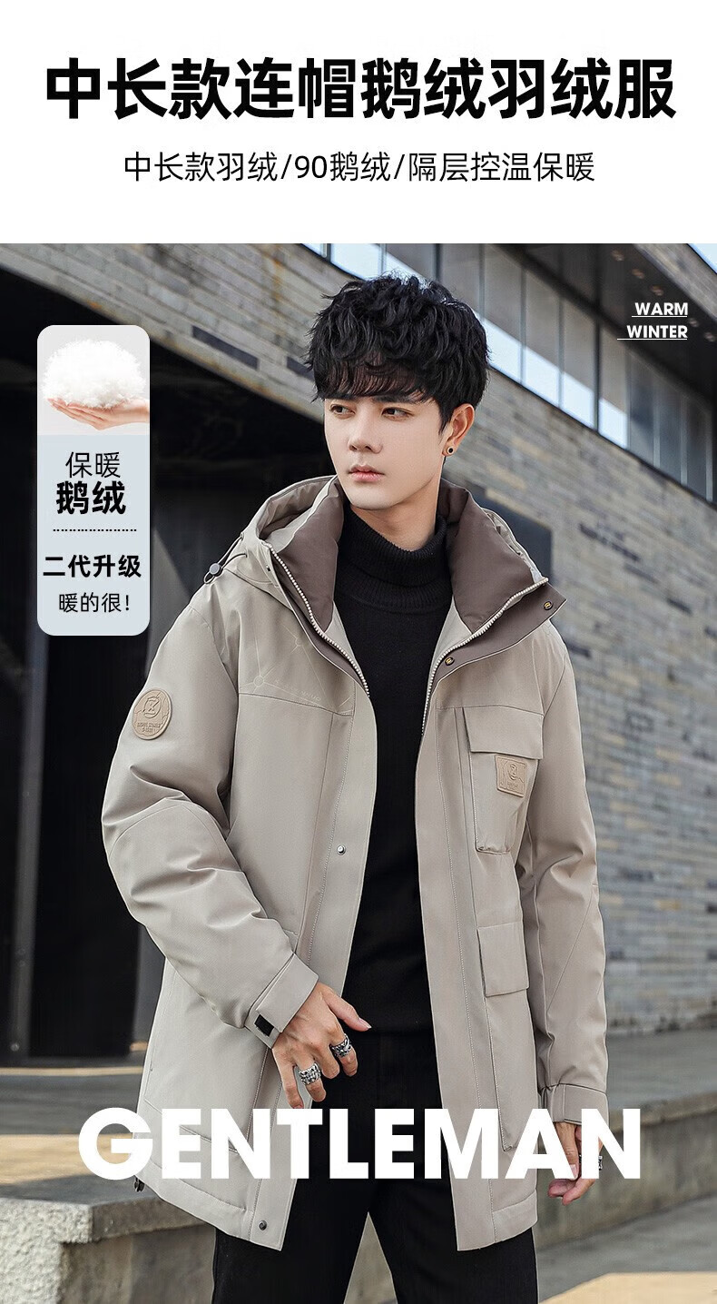 鸭鸭(YAYA)鹅绒羽绒服男连帽中长款冬季厚款休闲百搭保暖中青年纯色鹅绒外套 卡其 L 175(建议115-130斤)
