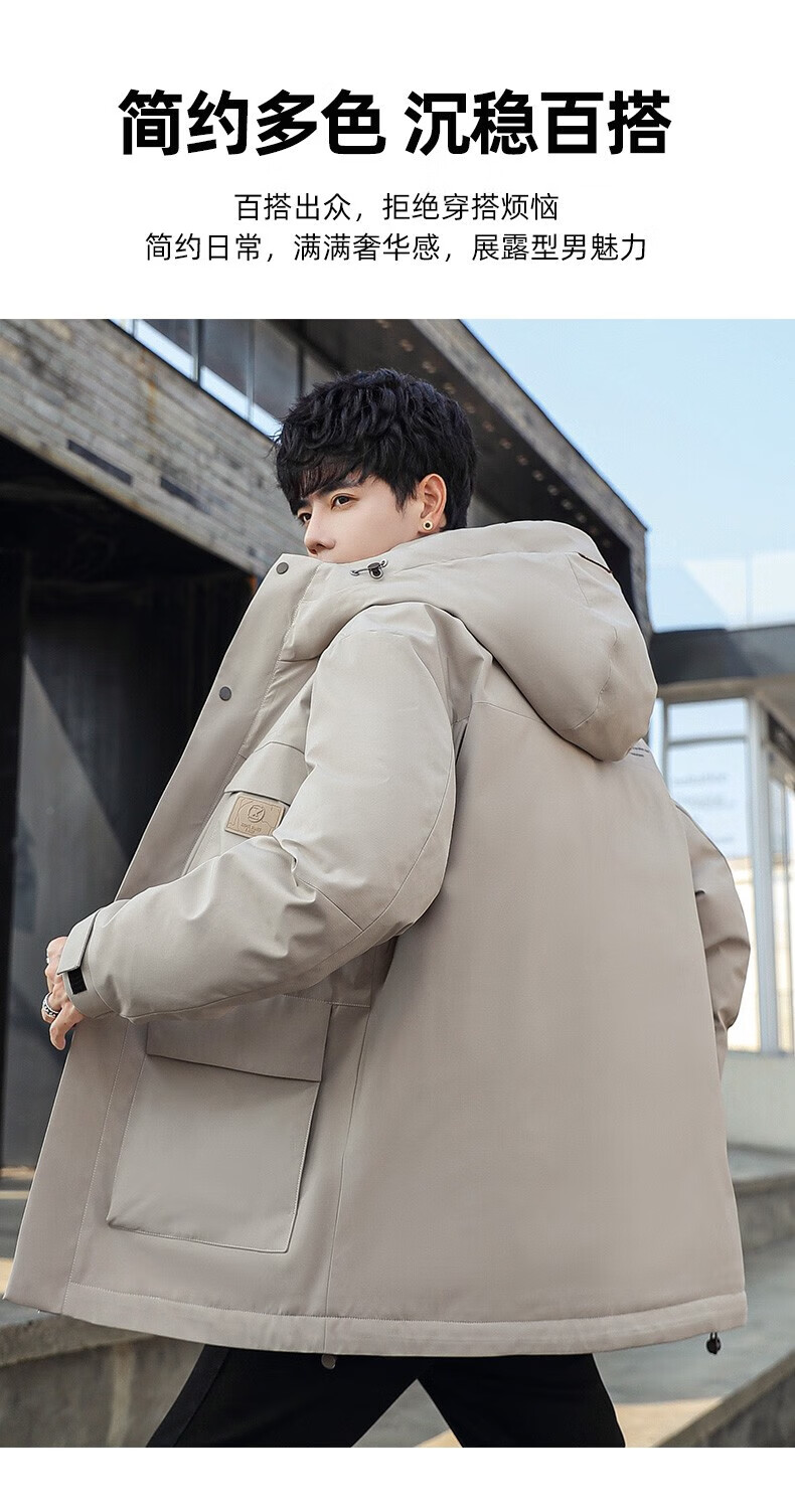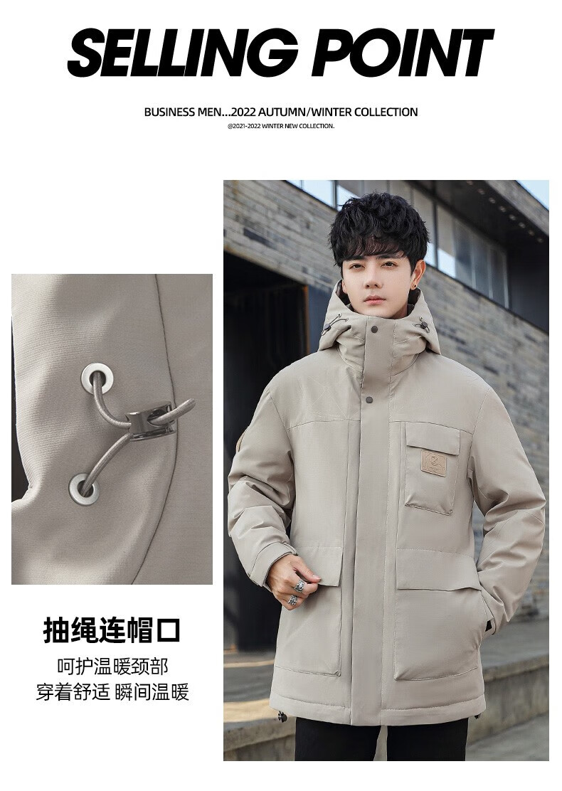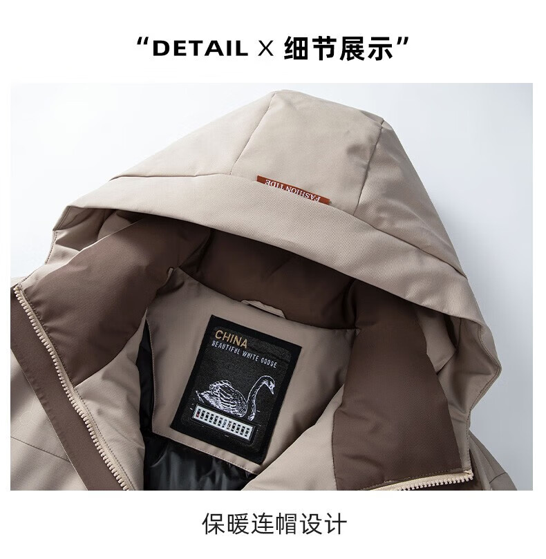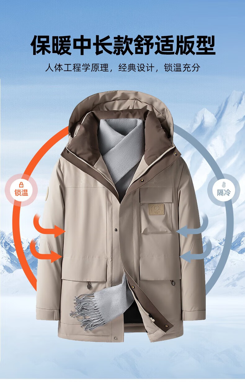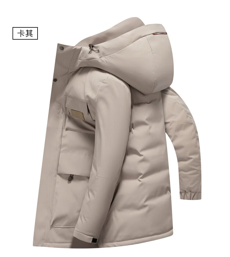 鸭鸭(YAYA)鹅绒羽绒服男连帽中长款冬季厚款休闲百搭保暖中青年纯色鹅绒外套 卡其 L 175(建议115-130斤)