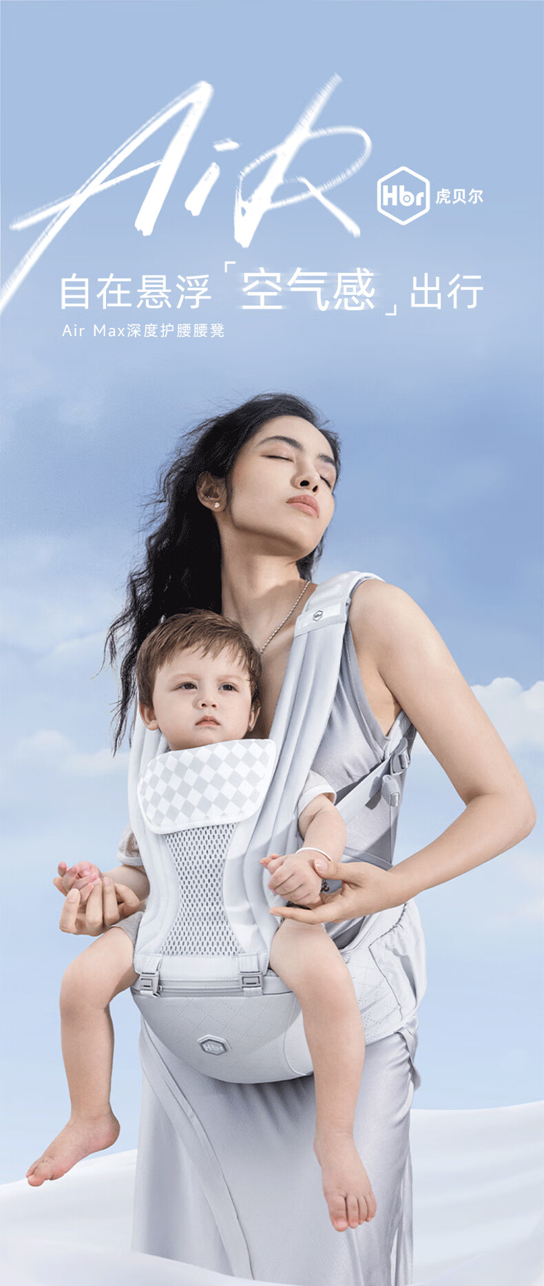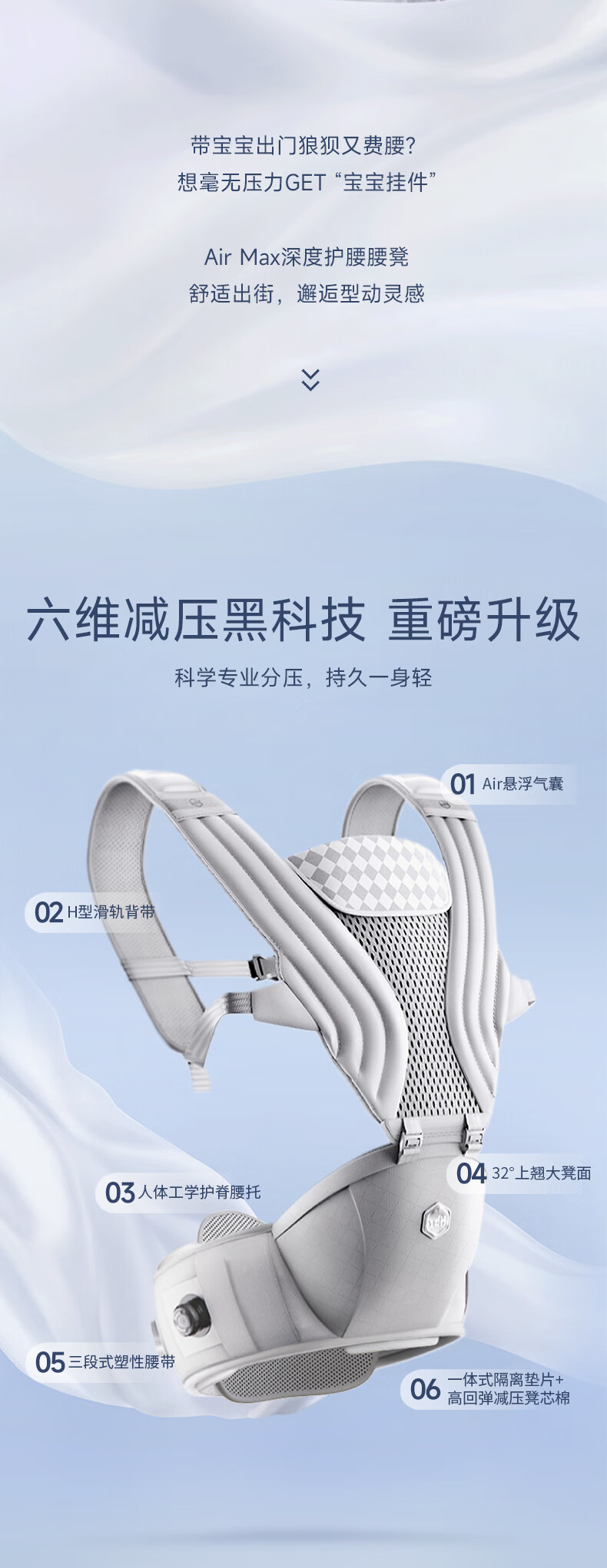 虎贝尔(HBR)Air Max深度护腰六维婴儿腰凳背带二合一轻便四季抱娃神器 银雾白