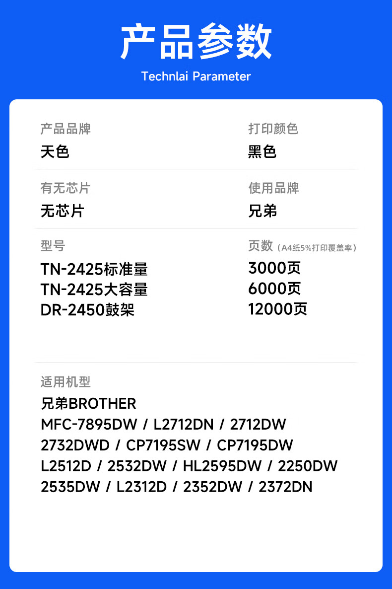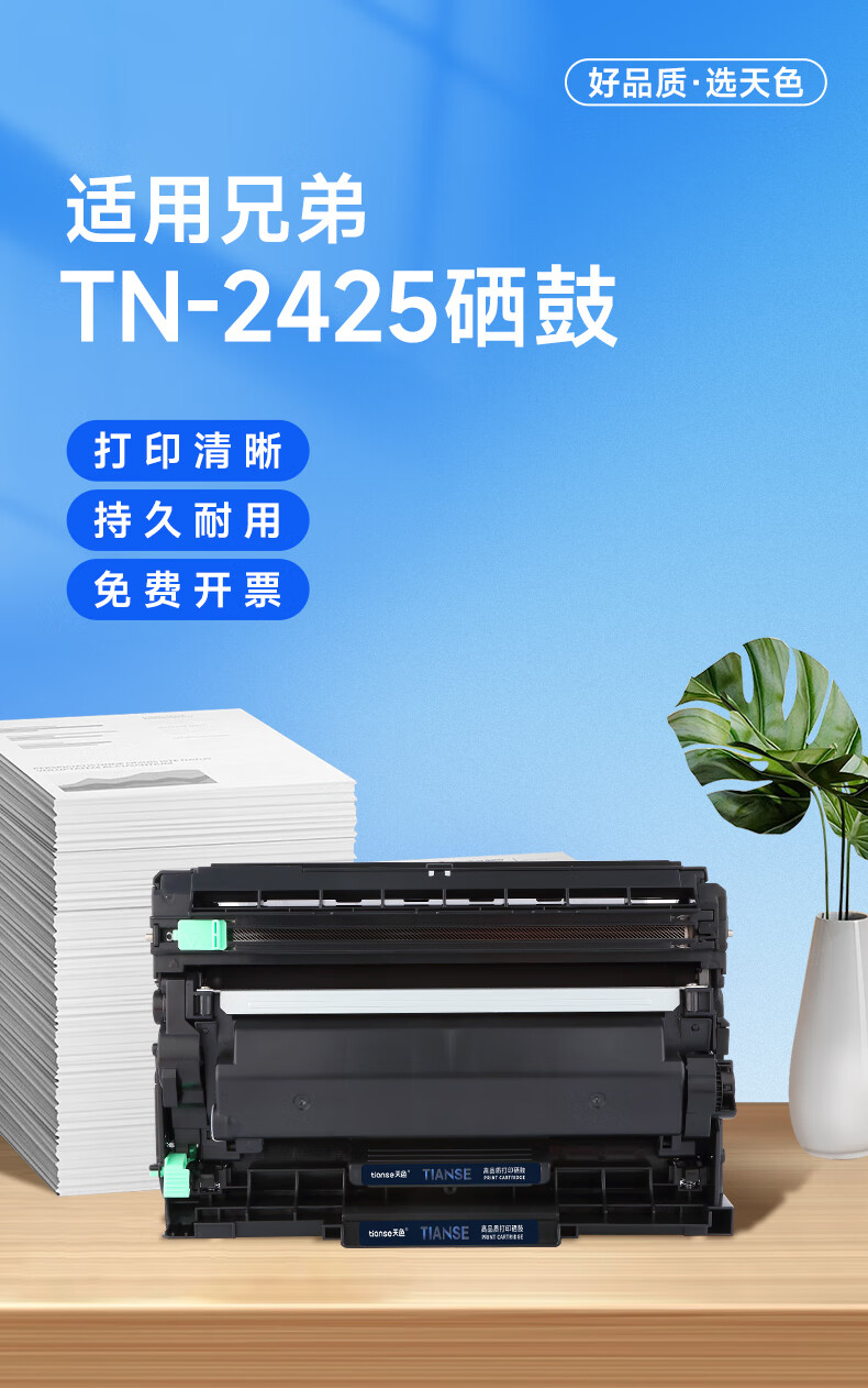 天色TN2425粉盒2支装适用兄弟7190DW硒鼓7090dw dcp-l2550dw MFC7895DW DCP7195DW墨盒HL2595DW 2535DW打印机粉盒