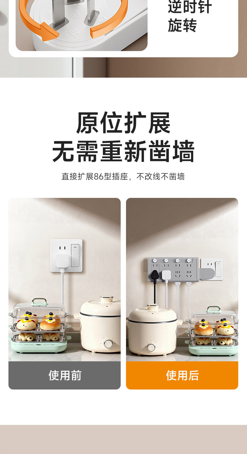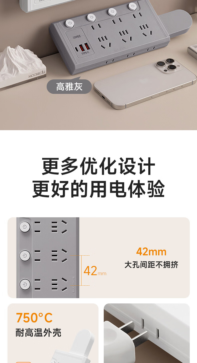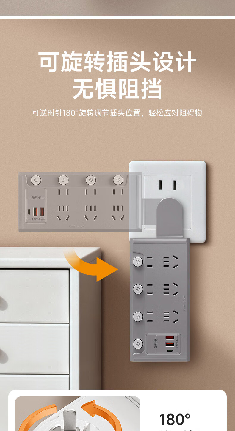 公正午无线扩展排插多功能转换器带USB快充可旋转分控一转多位插头家用宿舍用/插线板/接线板/拖线板 【普通款】高雅灰:一转八【纯铜+防雷】