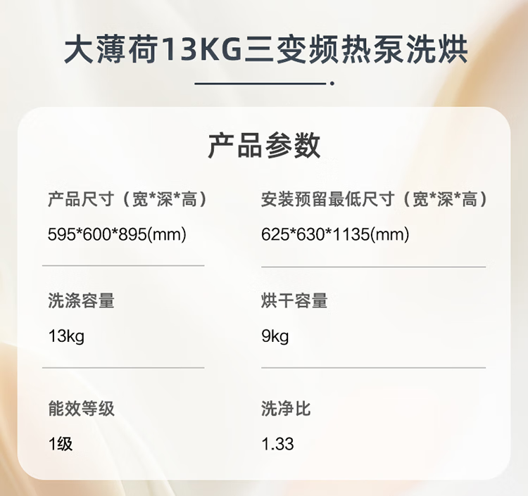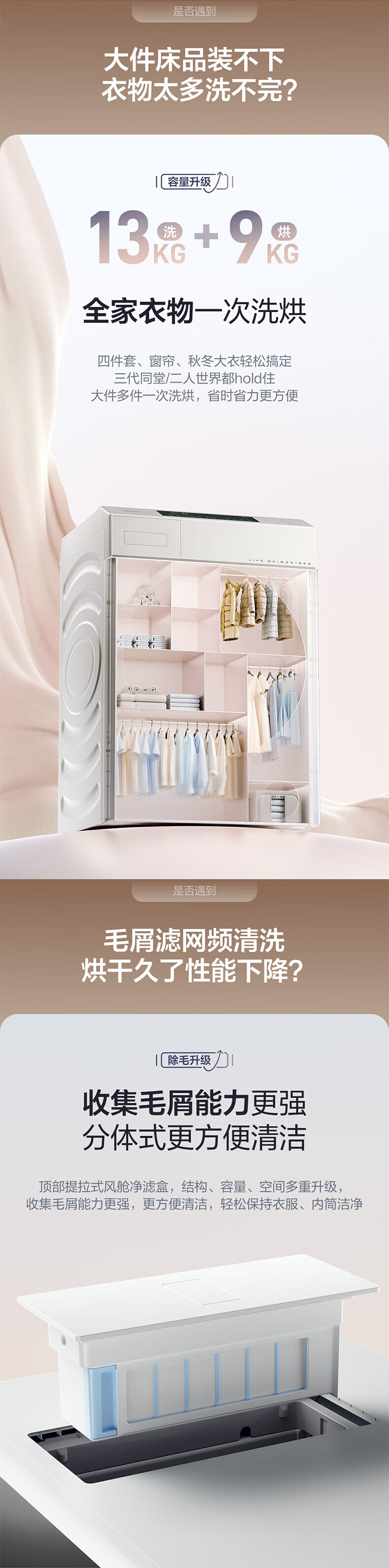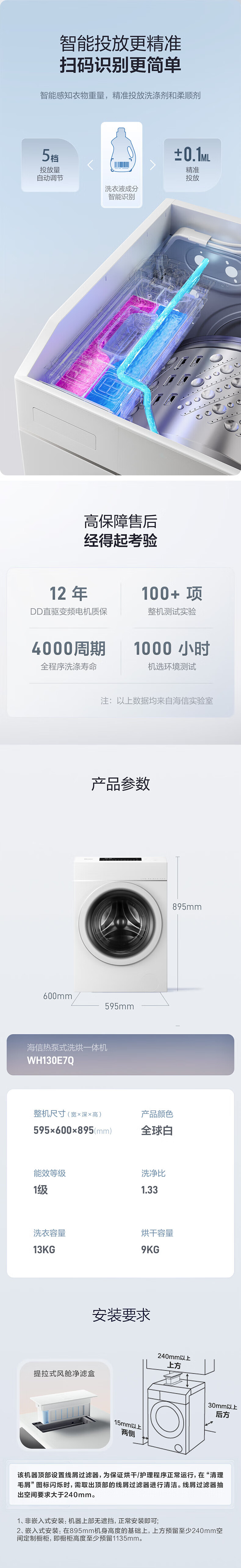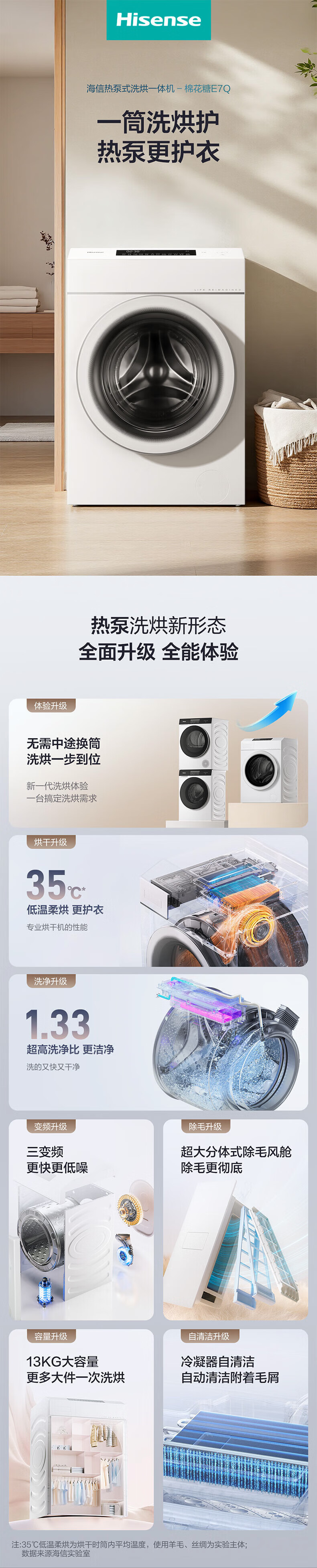 海信(Hisense)大薄荷热泵洗烘一体机E7Q洗衣机带烘干一体全自动滚筒洗衣机13kg大容量 活水洗 WH130E7Q 国家补贴 1.33至高洗净比|1:1正反转|三变频 洗烘一体 35℃低温柔烘更护衣|三层毛屑过滤|冷凝器自清洁