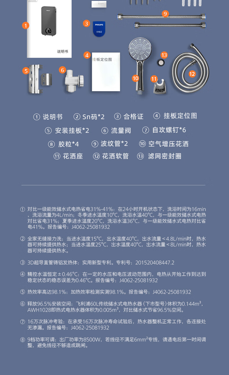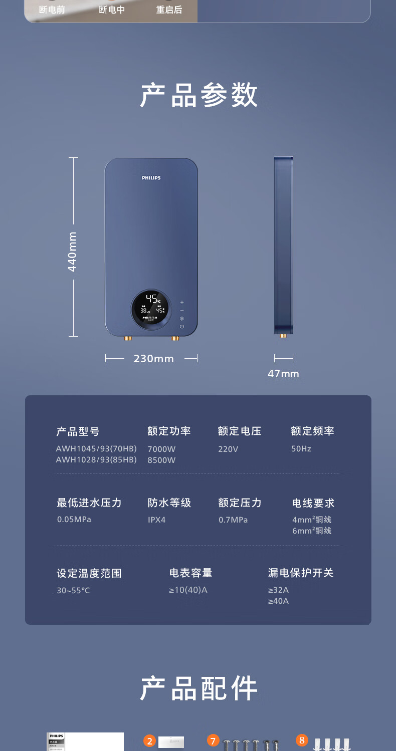 飞利浦(PHILIPS)即热式电热水器 电即热8500W速热无极变频智能恒温 无胆免储水AWH1028/93(85HB)