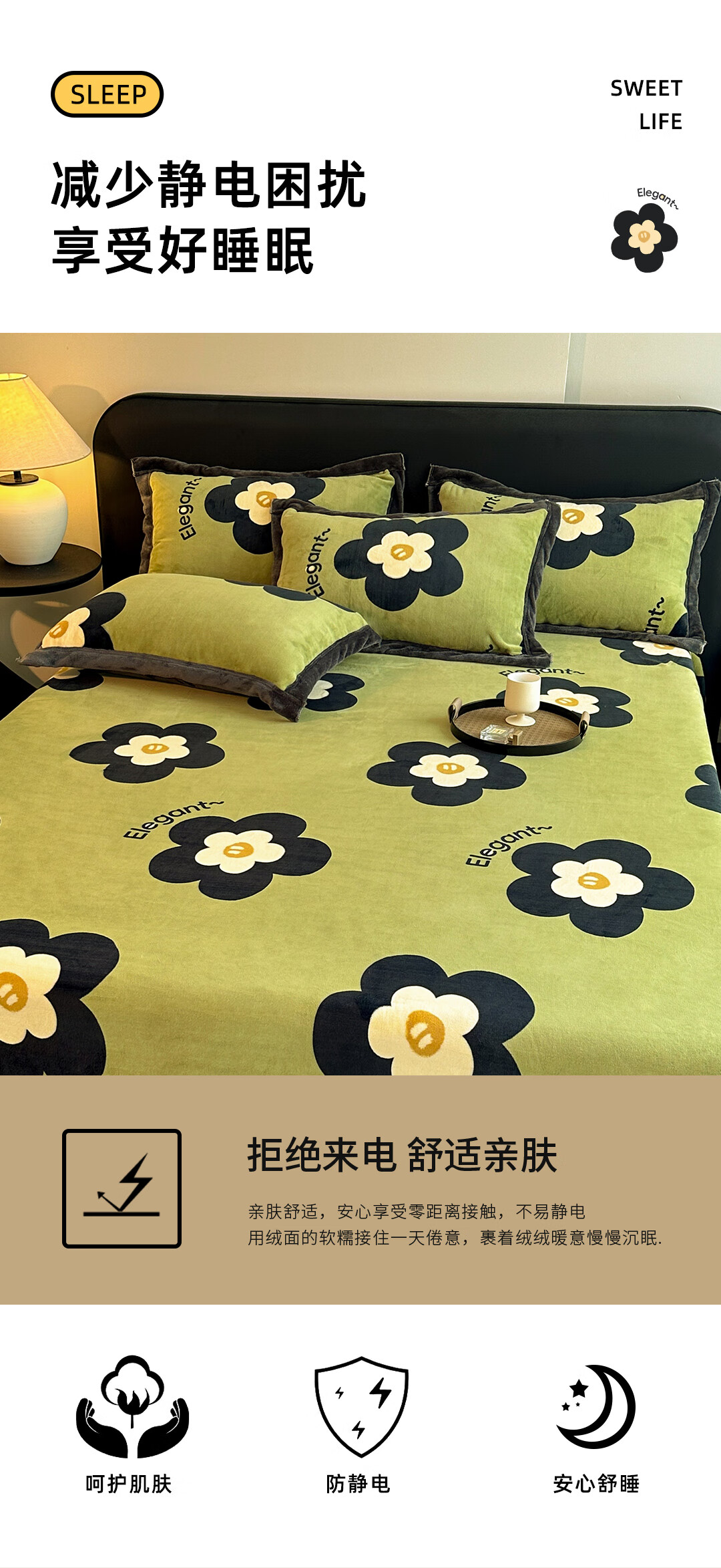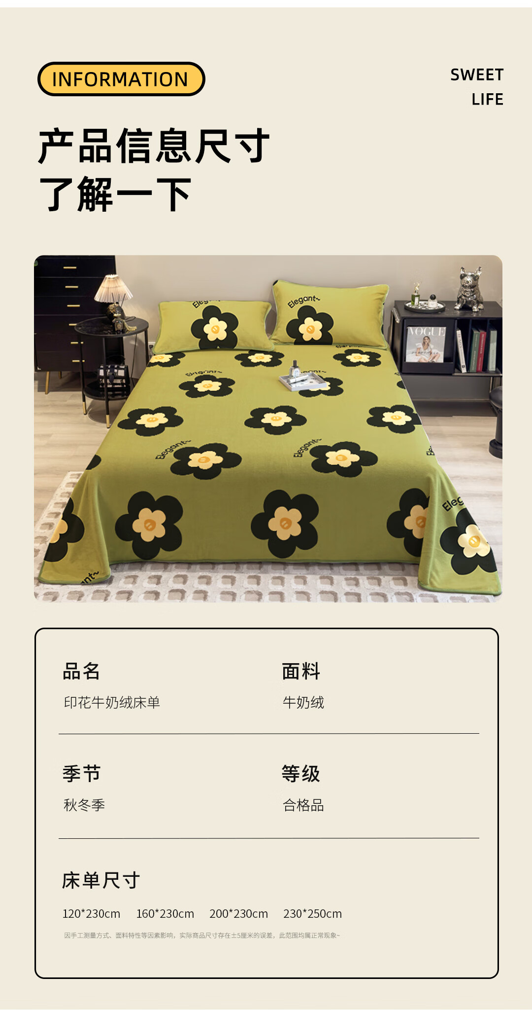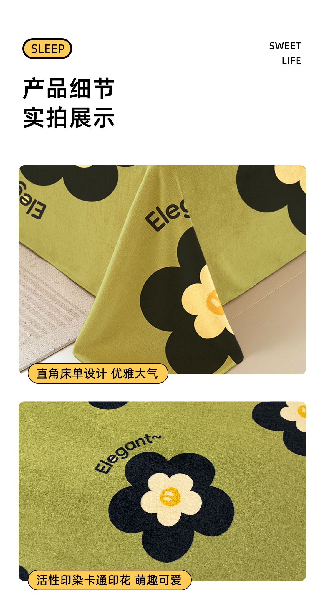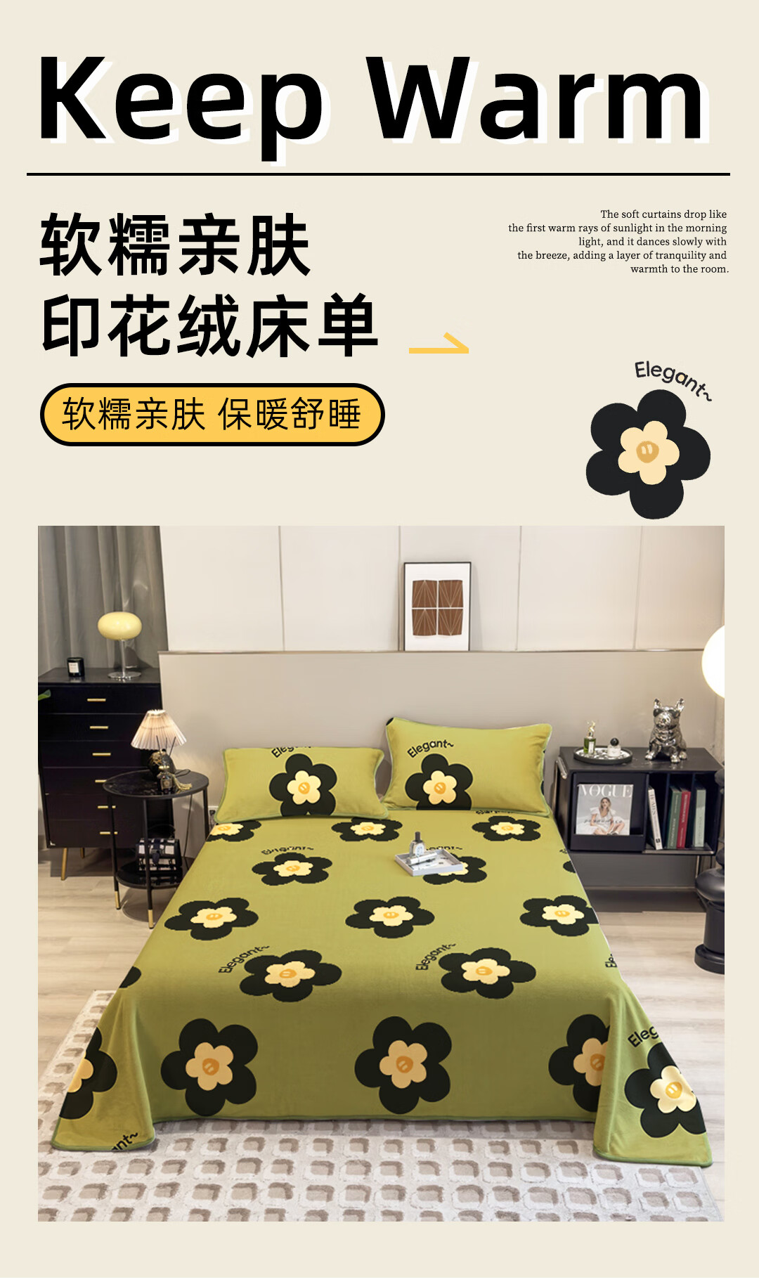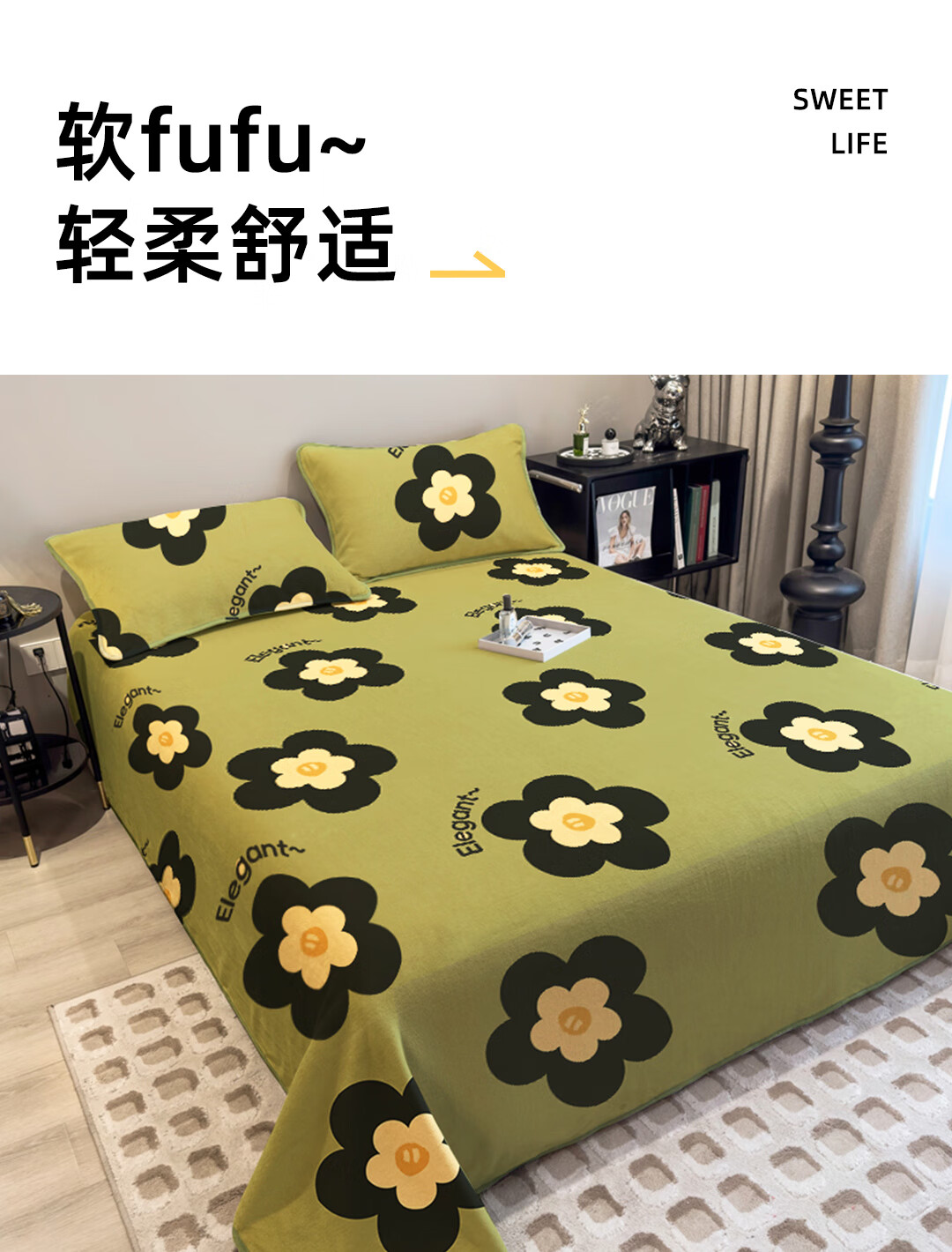 高睿加厚保暖牛奶绒床单单件双人宿舍学生宿舍被单床上专用冬季加绒 绿色大花 120*230cm
