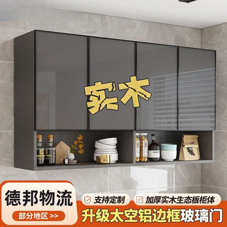 迈途森太空铝实木厨房吊柜墙壁柜餐厅多功能收纳柜厨房悬挂式橱柜储物柜 太空铝门深灰色-【高品质背板】 实木背板 -60*32*60两门