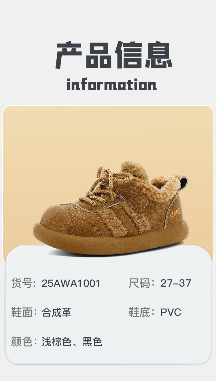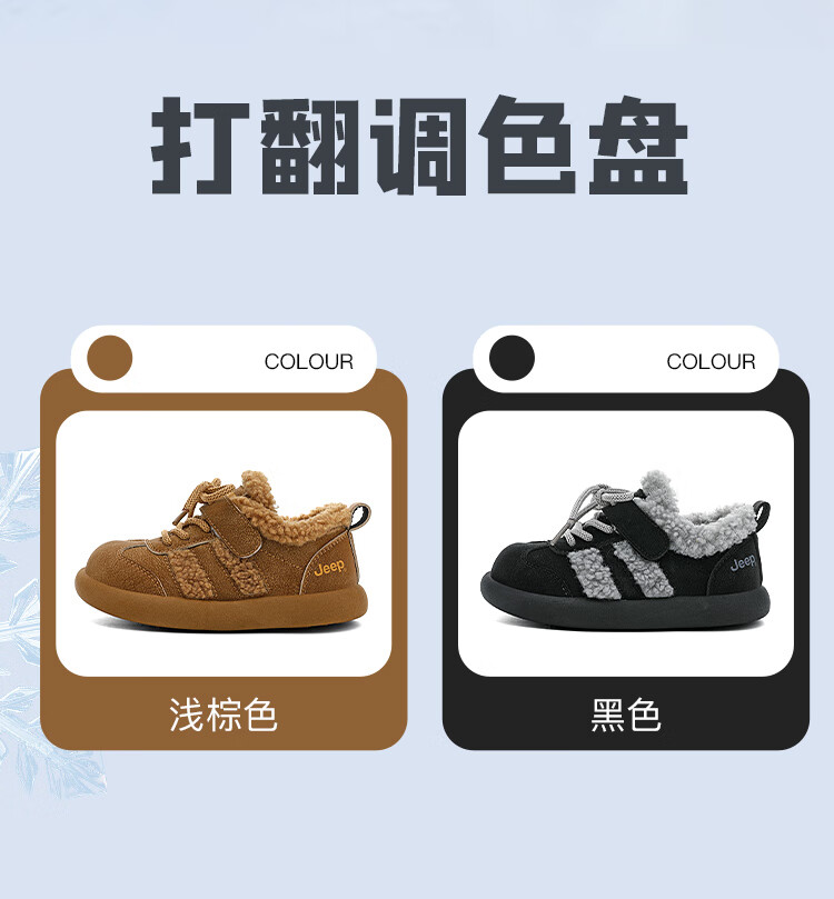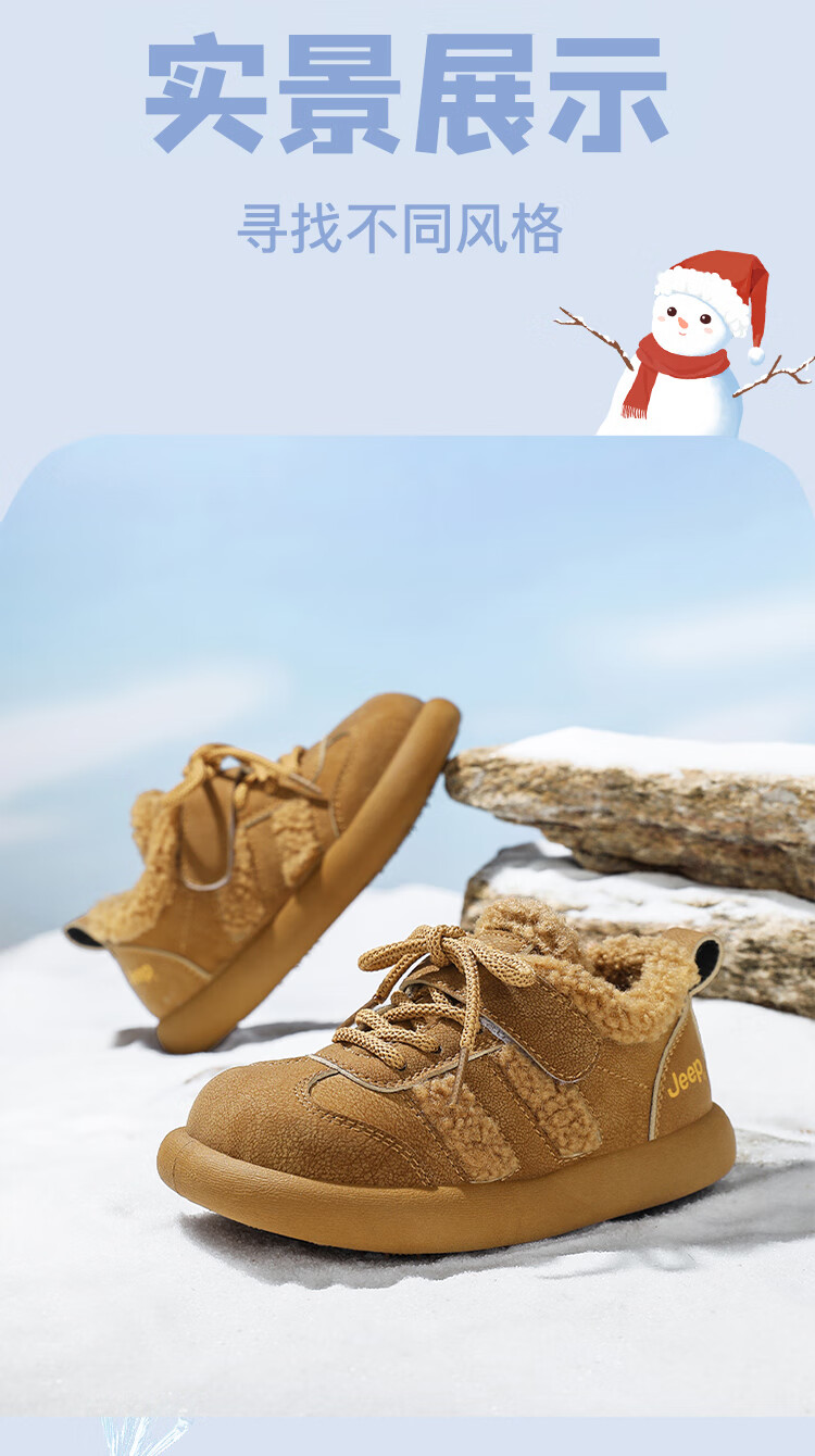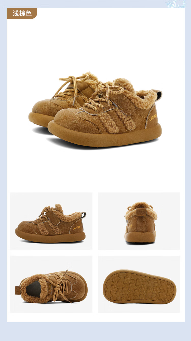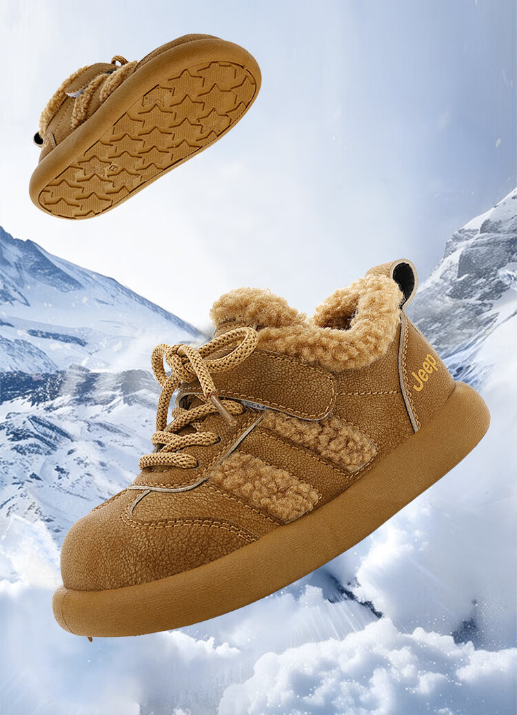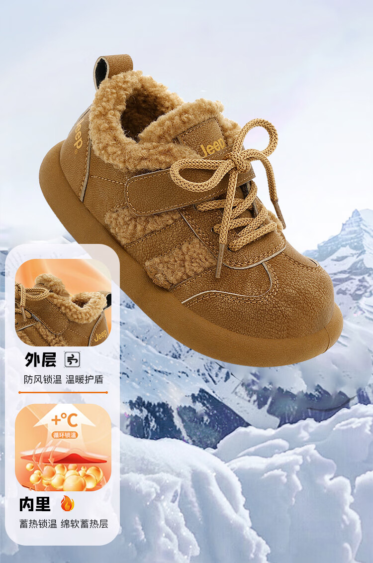 JEEPjeep儿童大棉鞋冬季跑步防滑运动儿童板鞋潮加绒加厚保暖软底冬鞋 浅棕色 28
