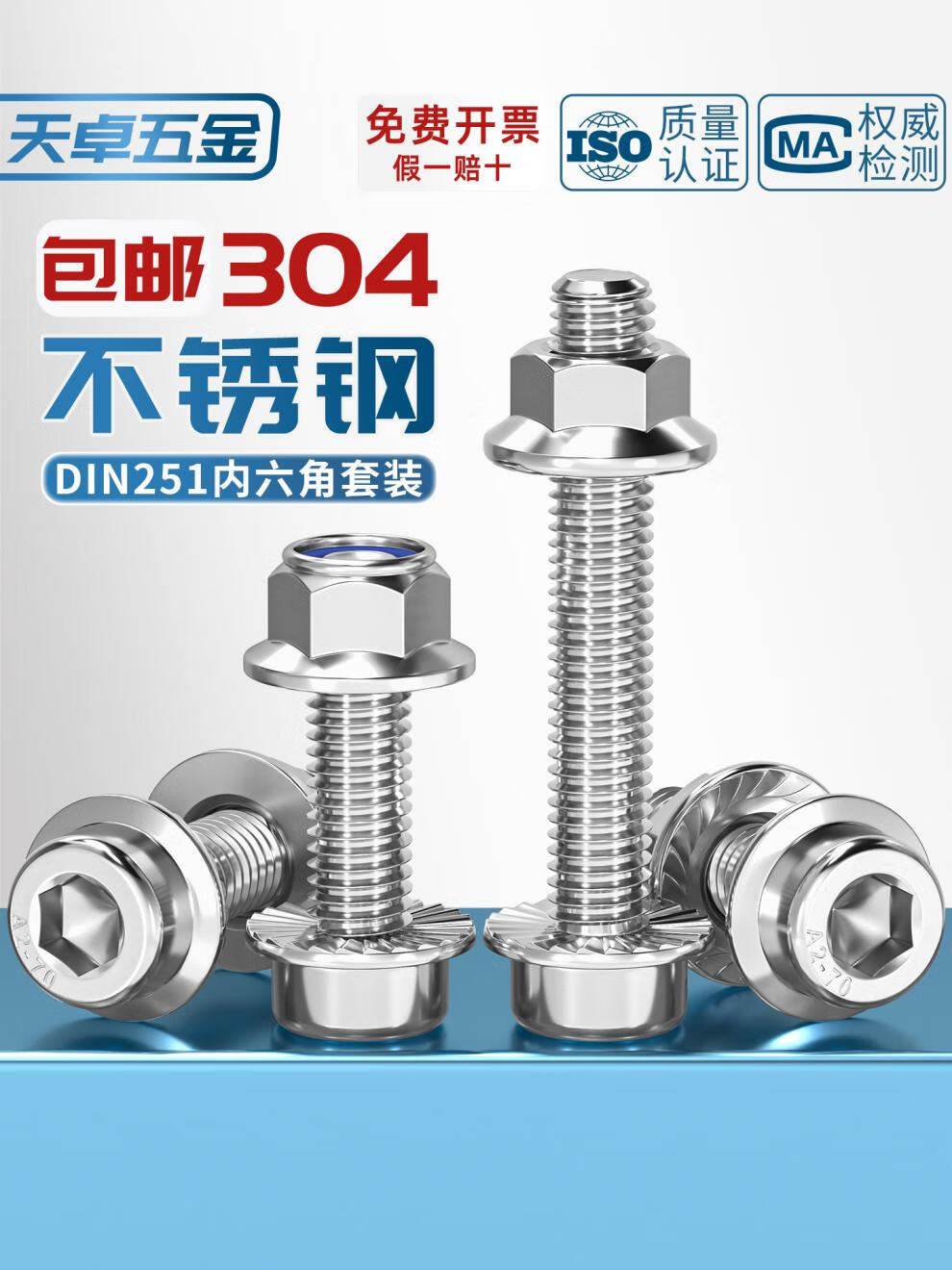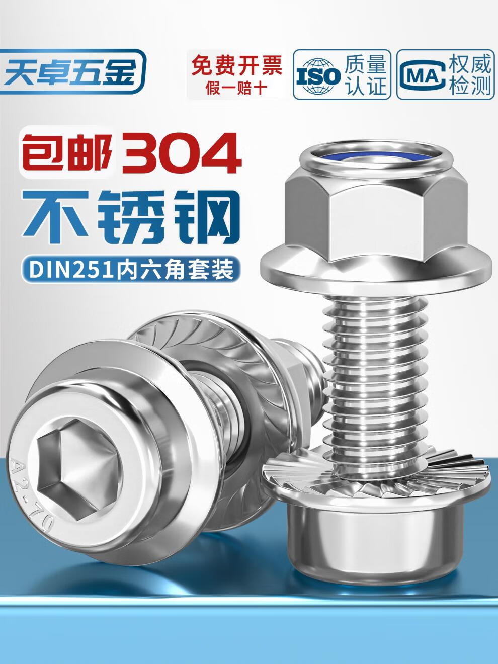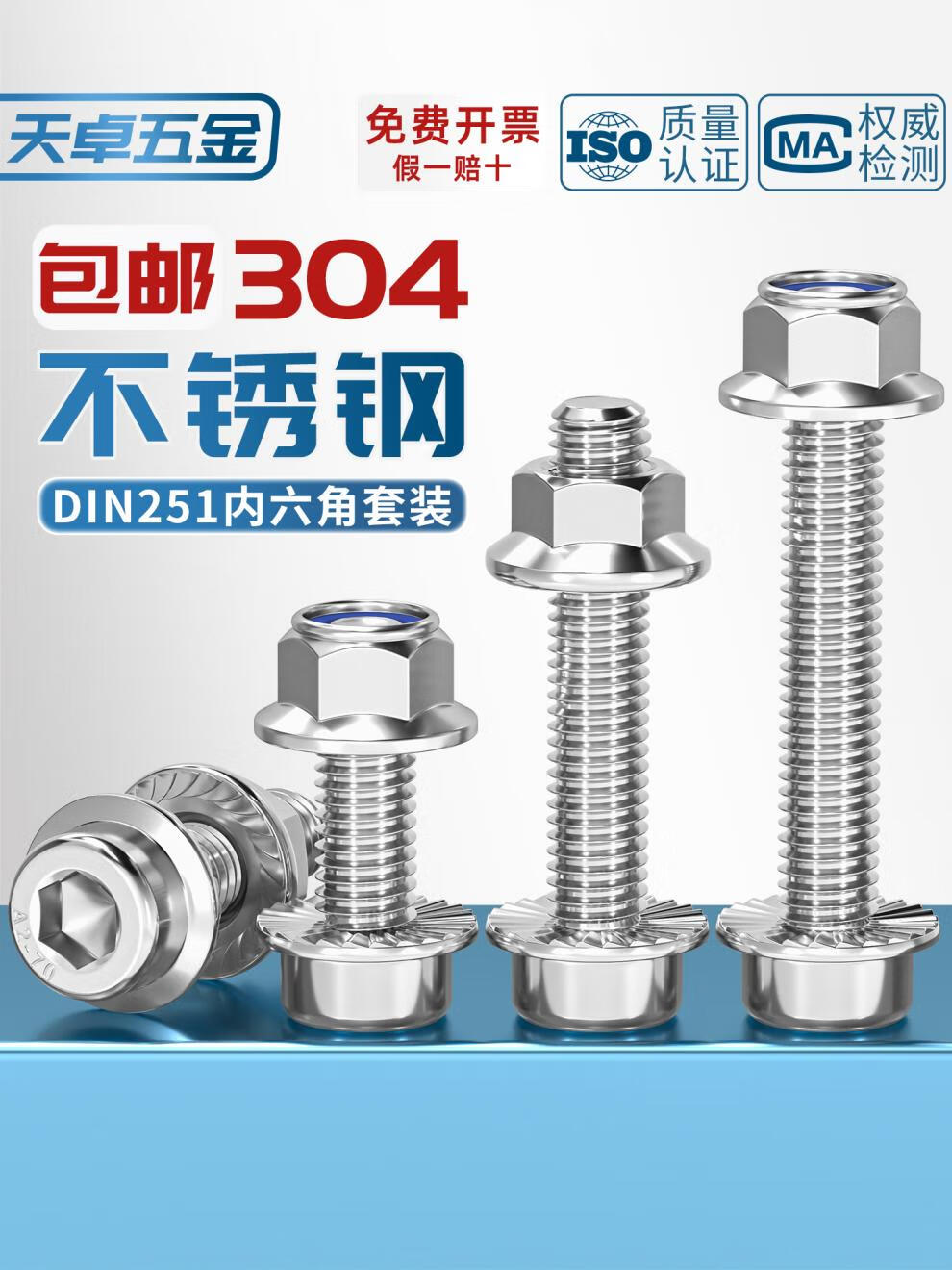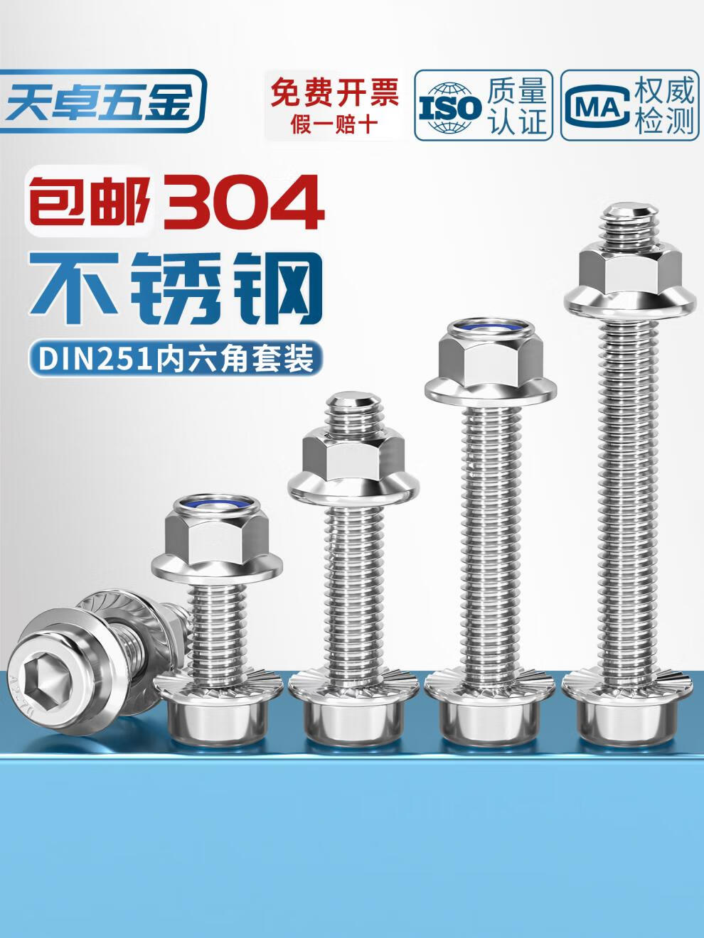 天卓五金304不锈钢法兰内六角螺丝DIN251组合螺母套装尼龙带齿带垫螺栓 M6*25(5套)锁紧