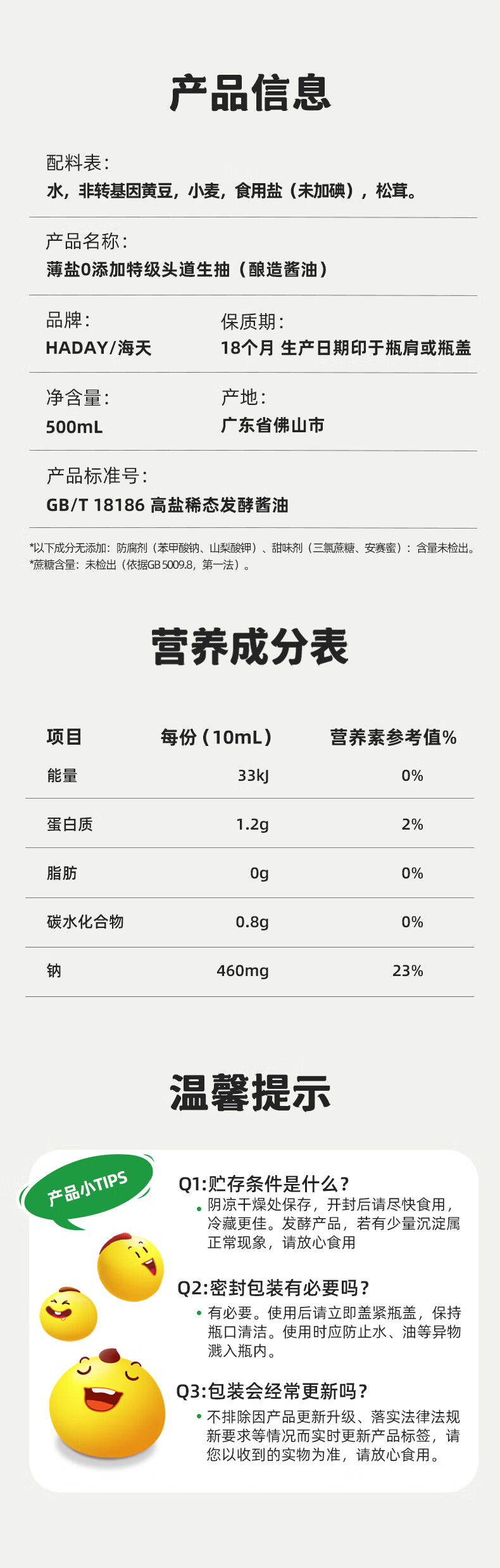 海天 特级头道酱油500ml【0添加薄盐 特级生抽】薄盐系列 0蔗糖