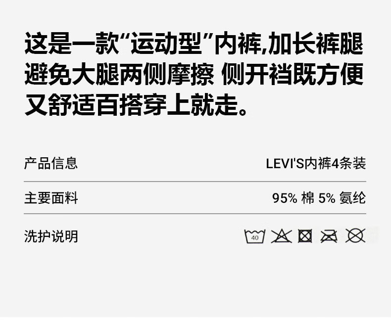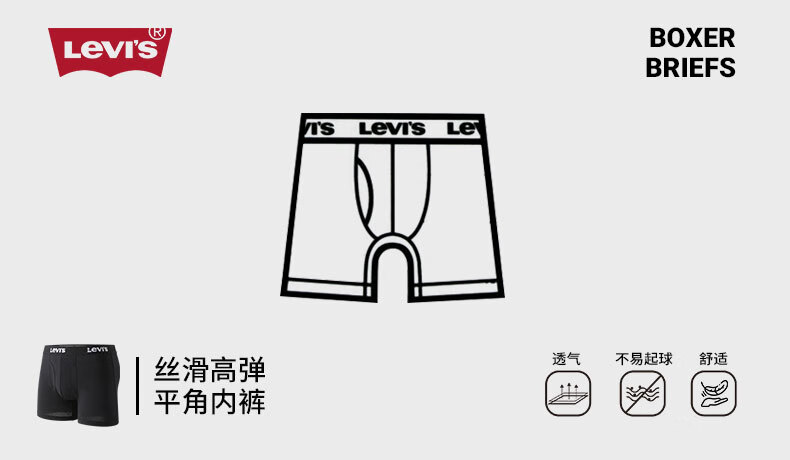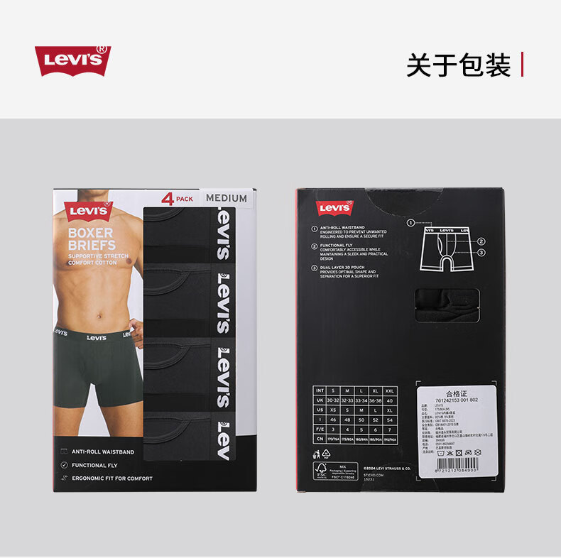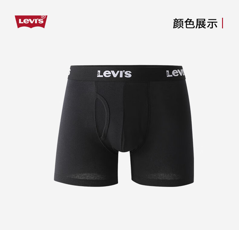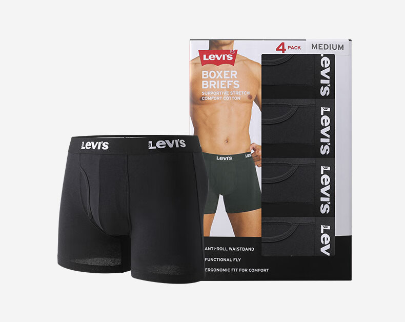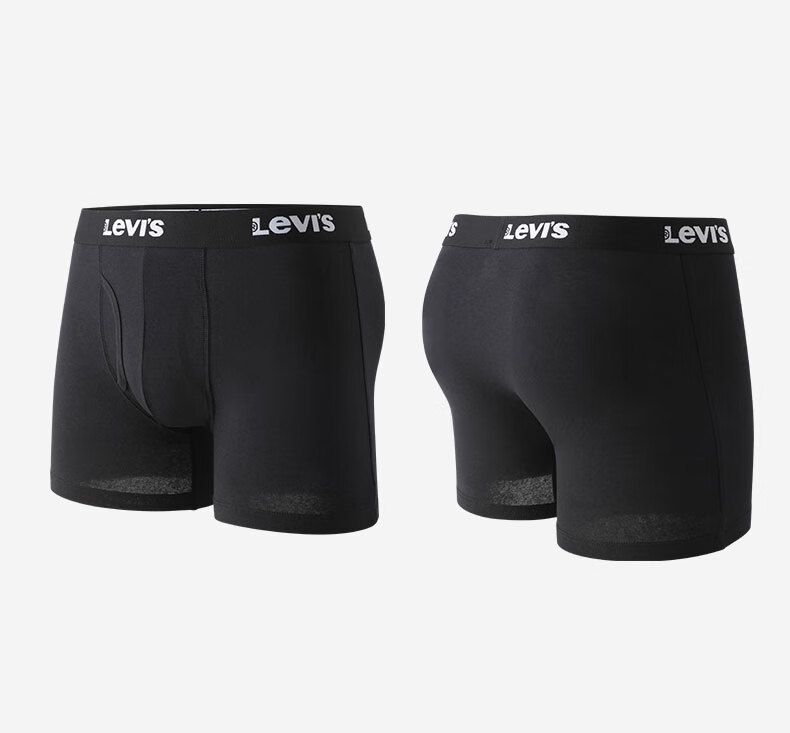 李维斯(Levi's)男士内裤平角高端中腰四角短裤加长运动休闲款透气防摩擦棉质4条 黑色 4条 S 170/76A