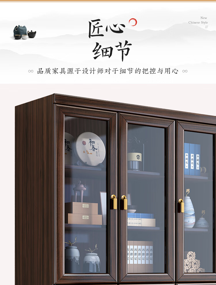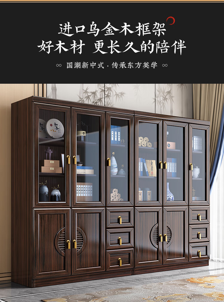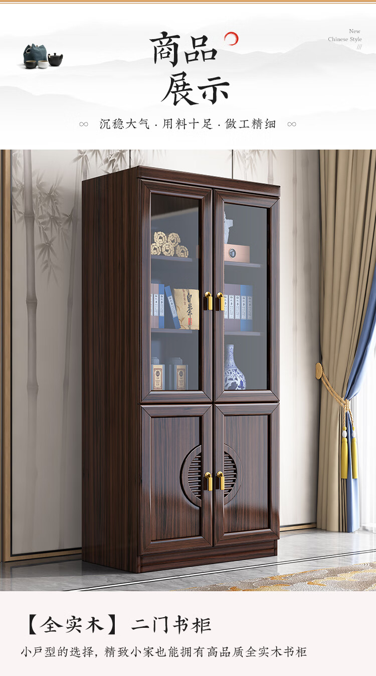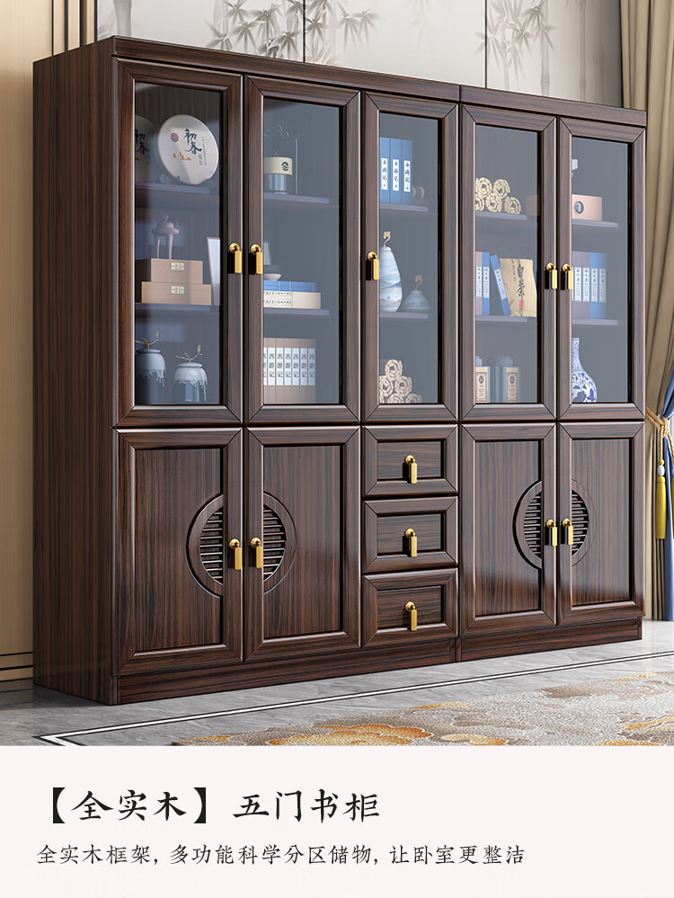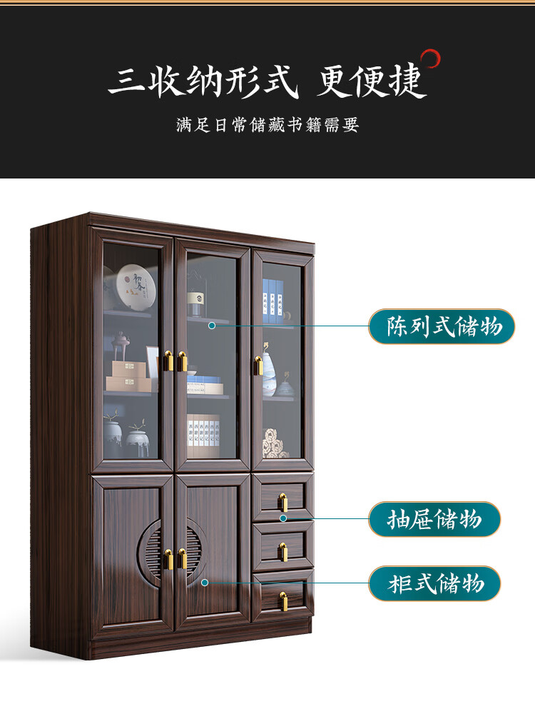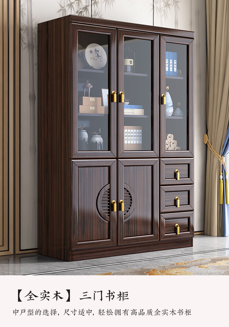 澜轩新中式乌金木实木书柜家用书房落地储物柜档案柜靠墙收纳展示柜 【乌金木】三门书柜