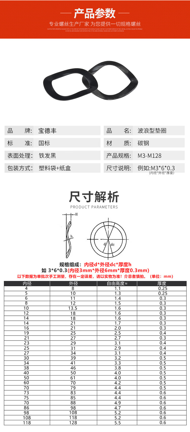 宝德丰三波峰垫圈波型垫片弹簧垫圈弹性垫圈国标紧固件标准件大全 3波峰-M3*6[500只]