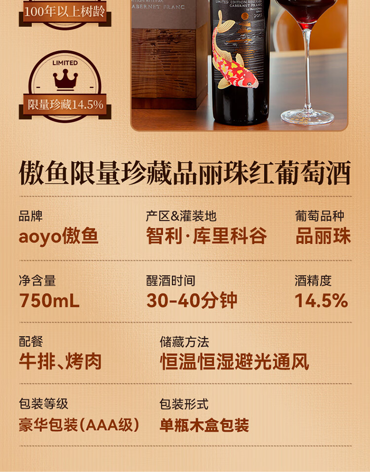 傲鱼【顺丰包邮】金智利原瓶原装进口品丽珠干红葡萄酒14.5度750ml 750ml*1瓶