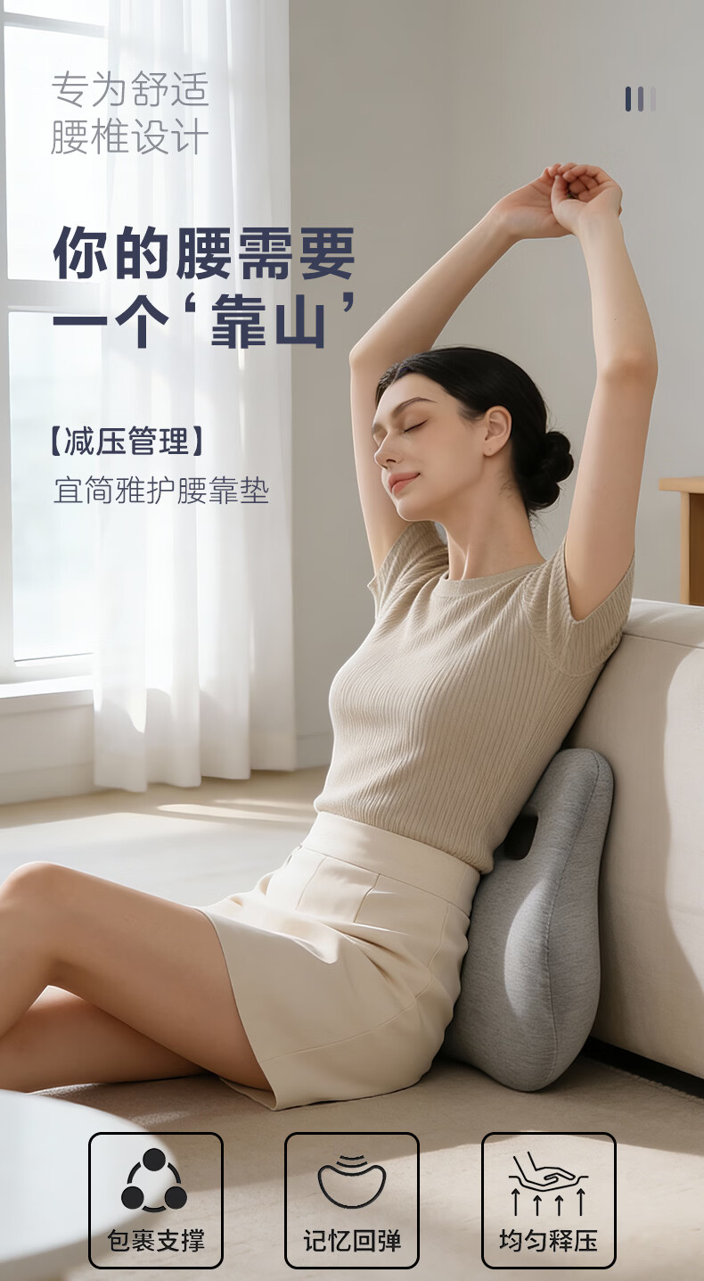 宜简雅汽车腰靠垫办公室护腰垫车载久坐腰枕座椅靠枕腰突支撑腰托男女 深灰色-办公车载腰垫