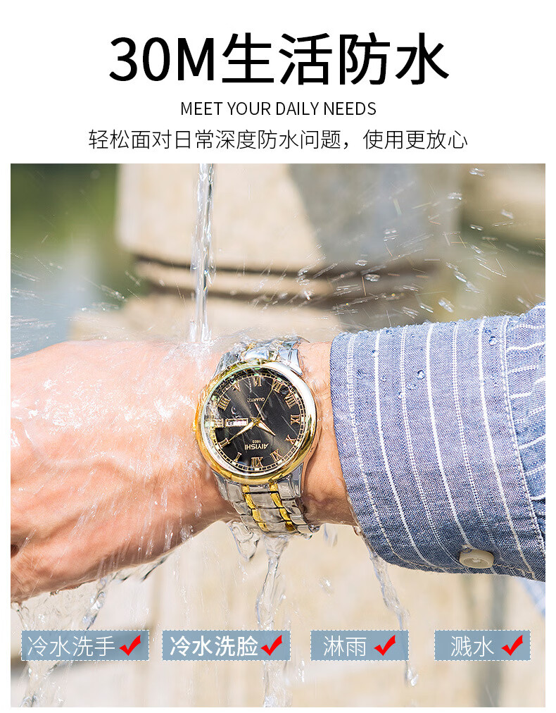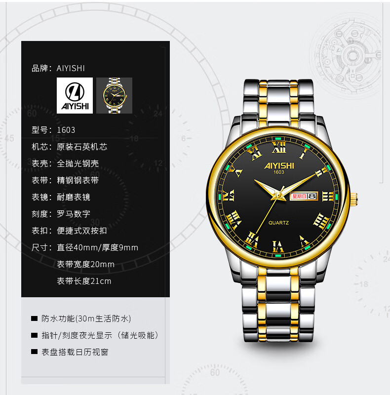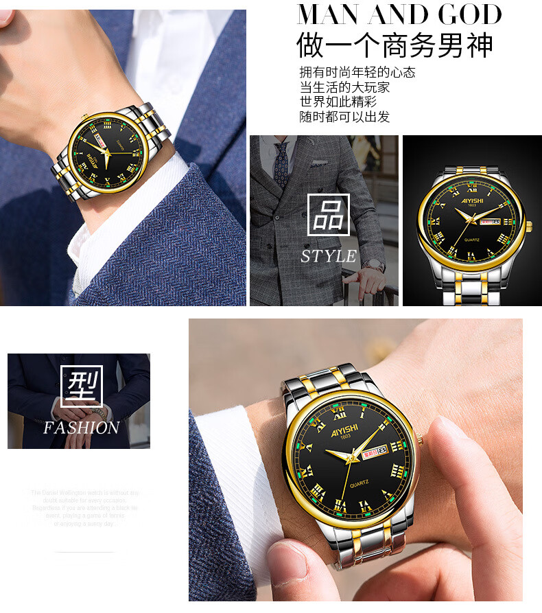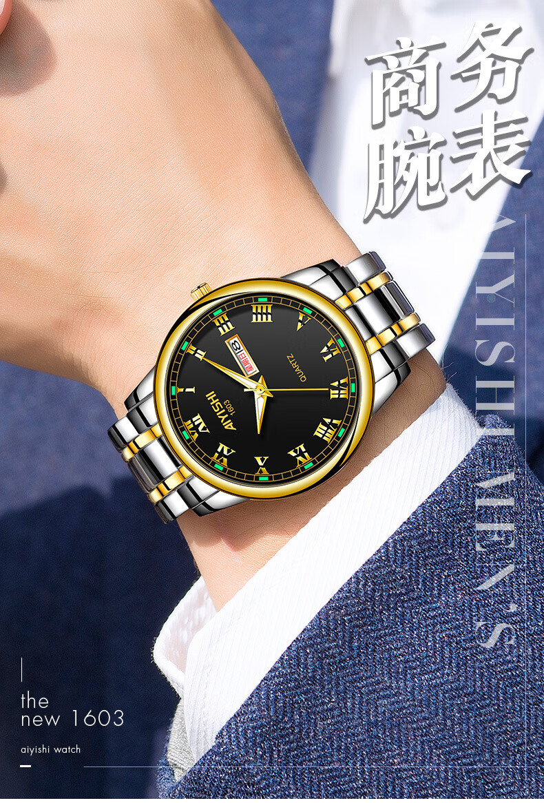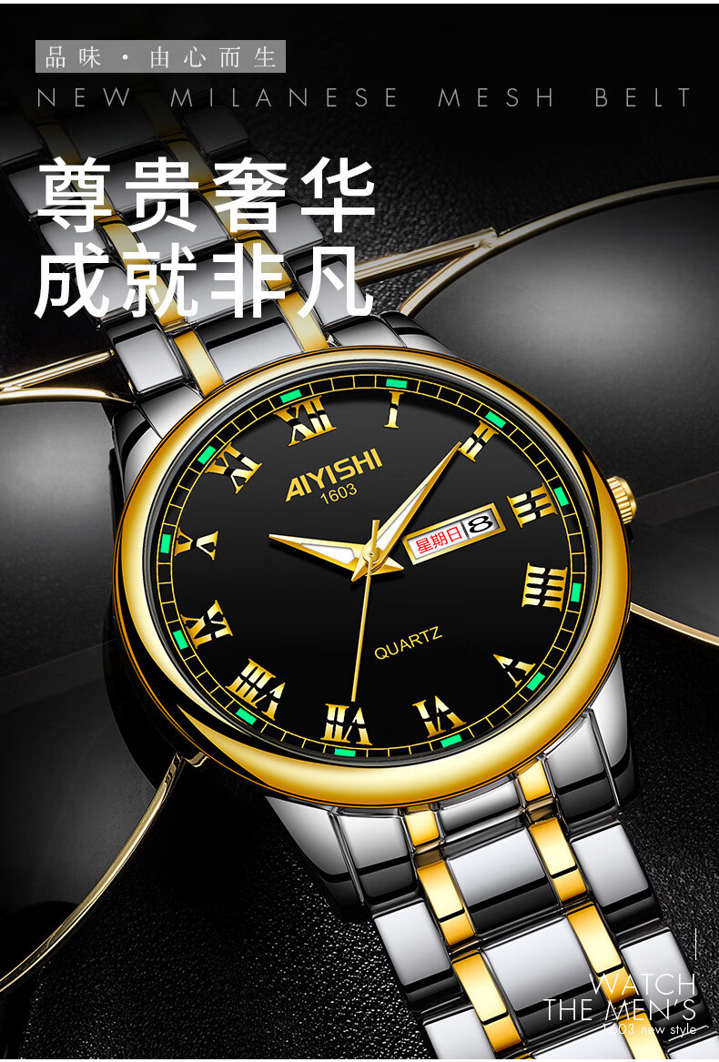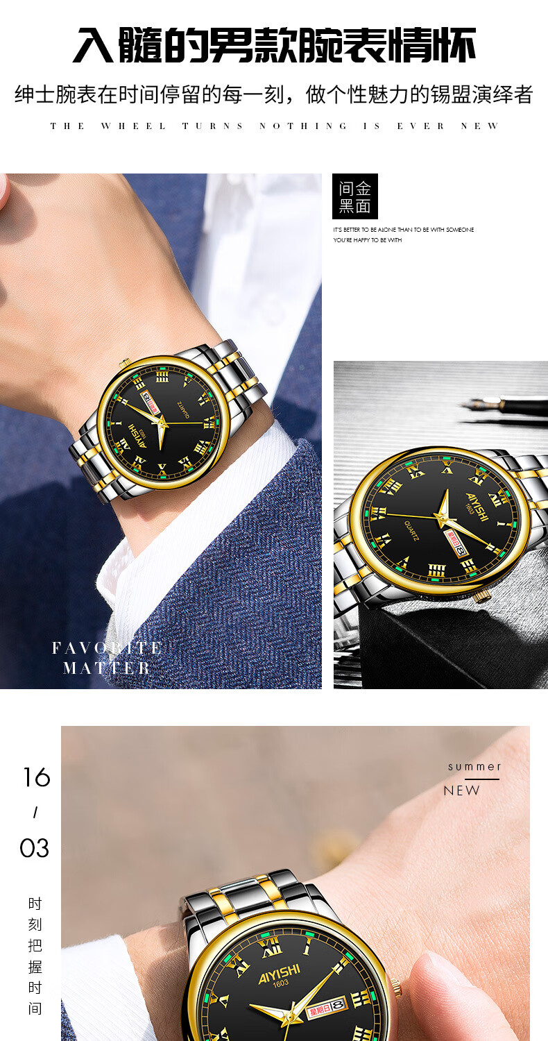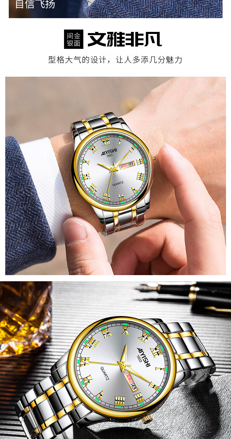 爱依士(AIYISHI)潮流时尚瑞士名表防水夜光表男款合金石英表高颜值男士商务手表 间金红面【瑞士机芯+终身质保】