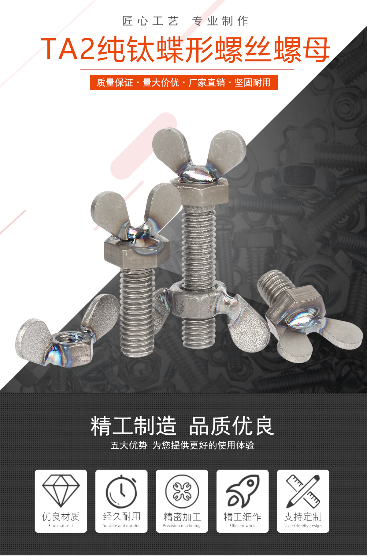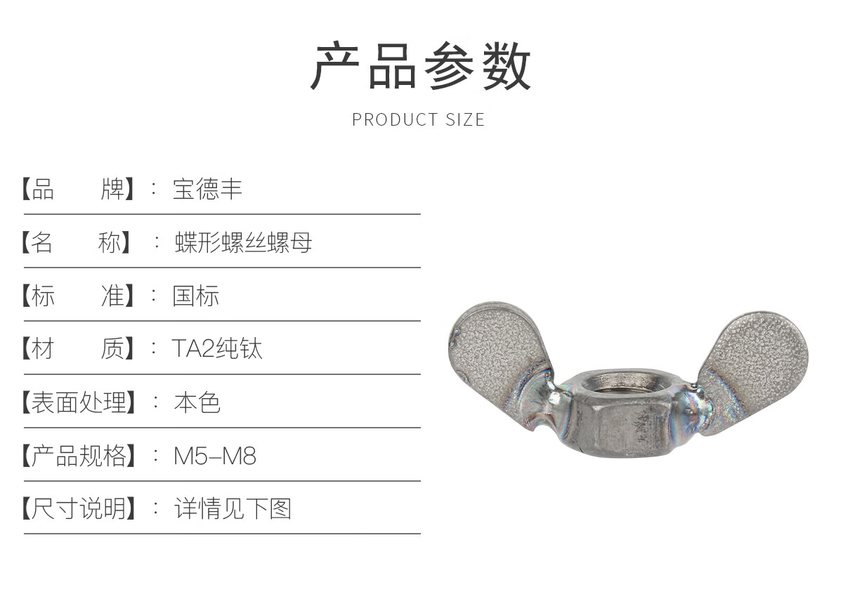 宝德丰国标TA2纯钛蝶形螺丝钛合金蝴蝶型羊角螺母螺钉元宝手拧螺栓M5-M8 M5x10(2只)