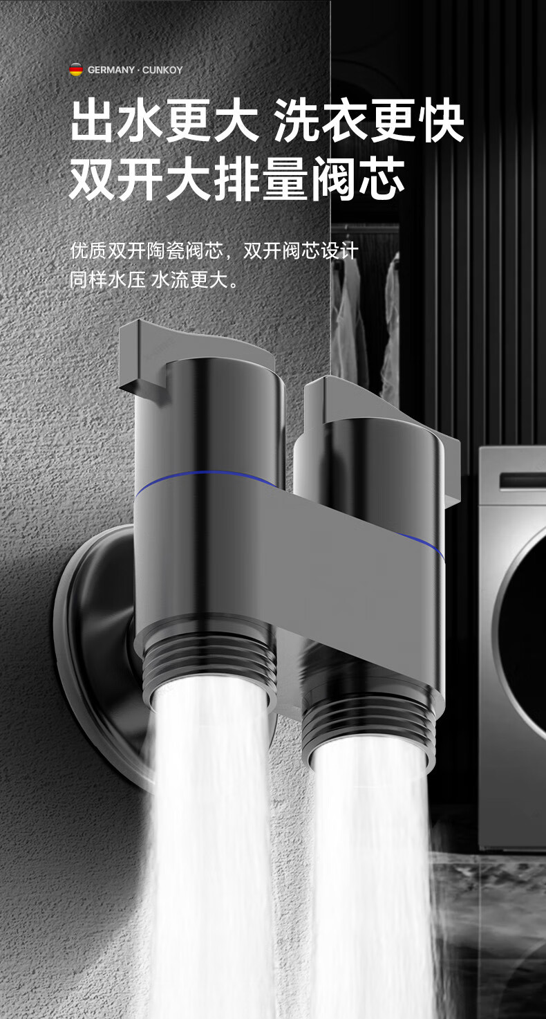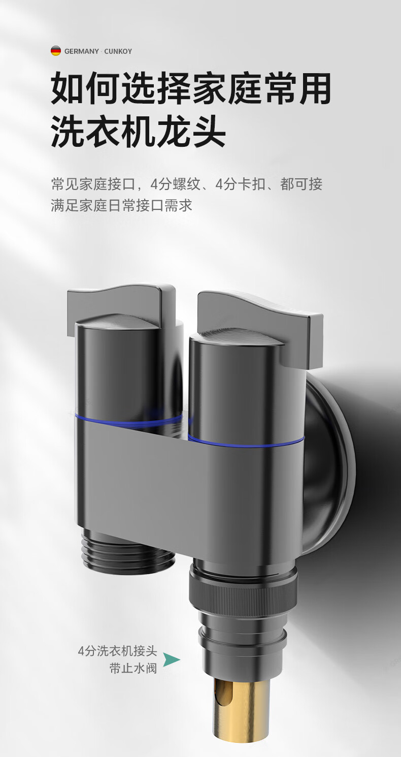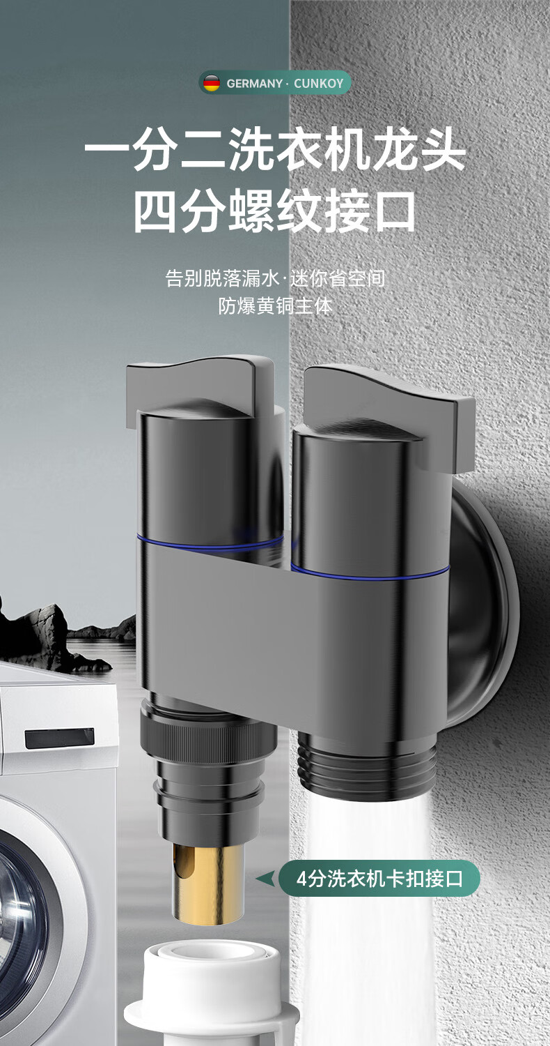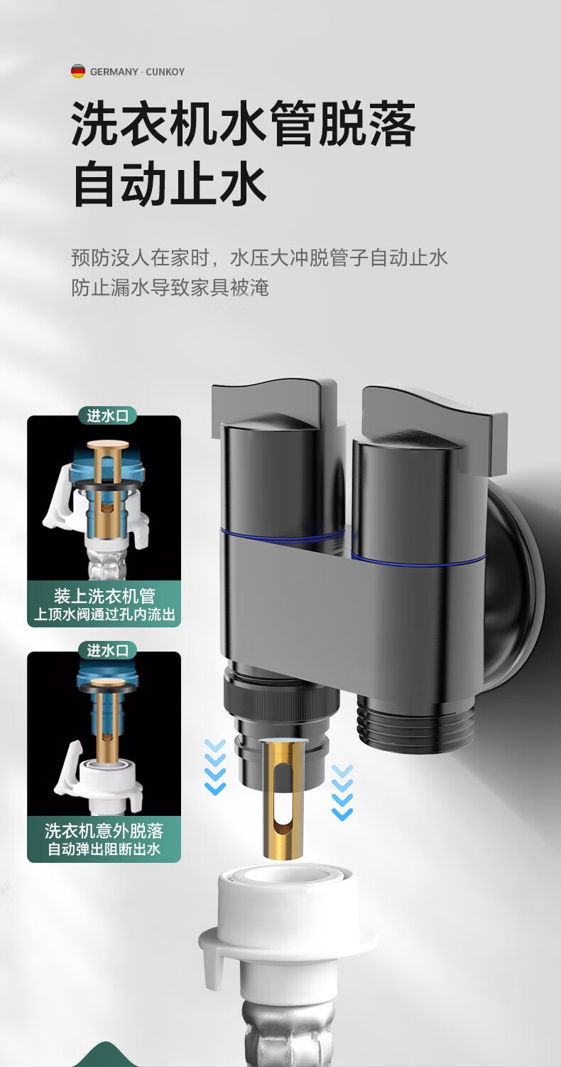 CUNKOY【德国】洗衣机水龙头全铜主体角阀4分接口专用防脱落自动止水阀 双出水洗衣机龙头【全铜主体】枪灰 4分通用接口丨脱管自动止水