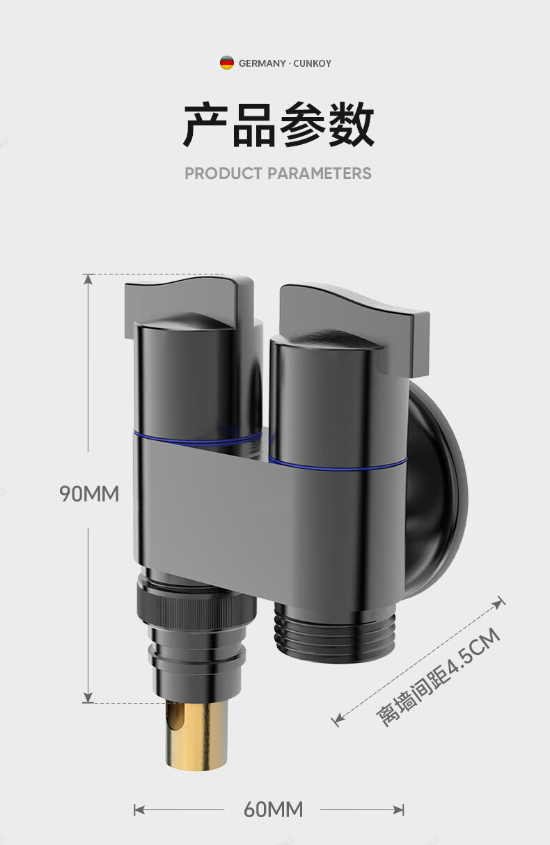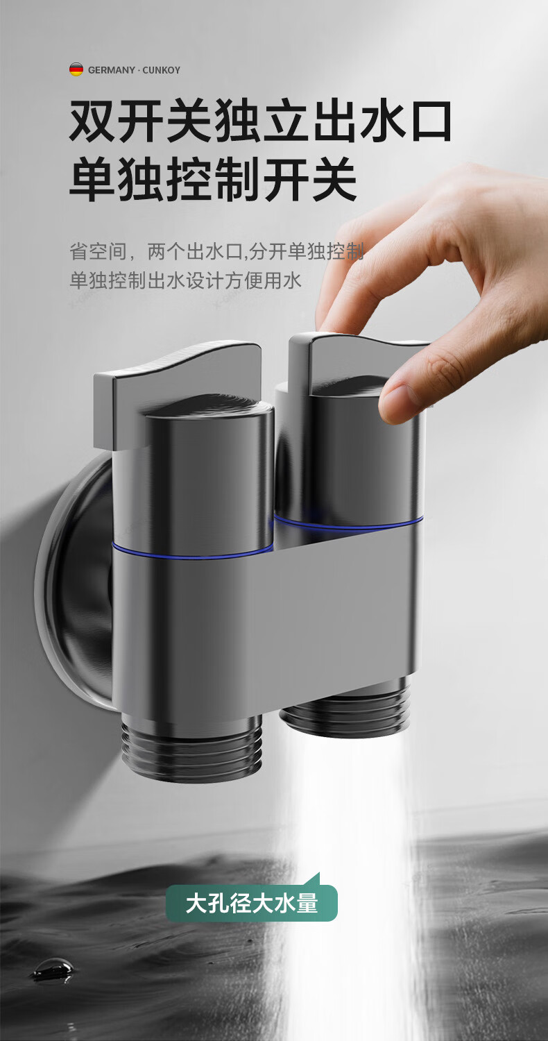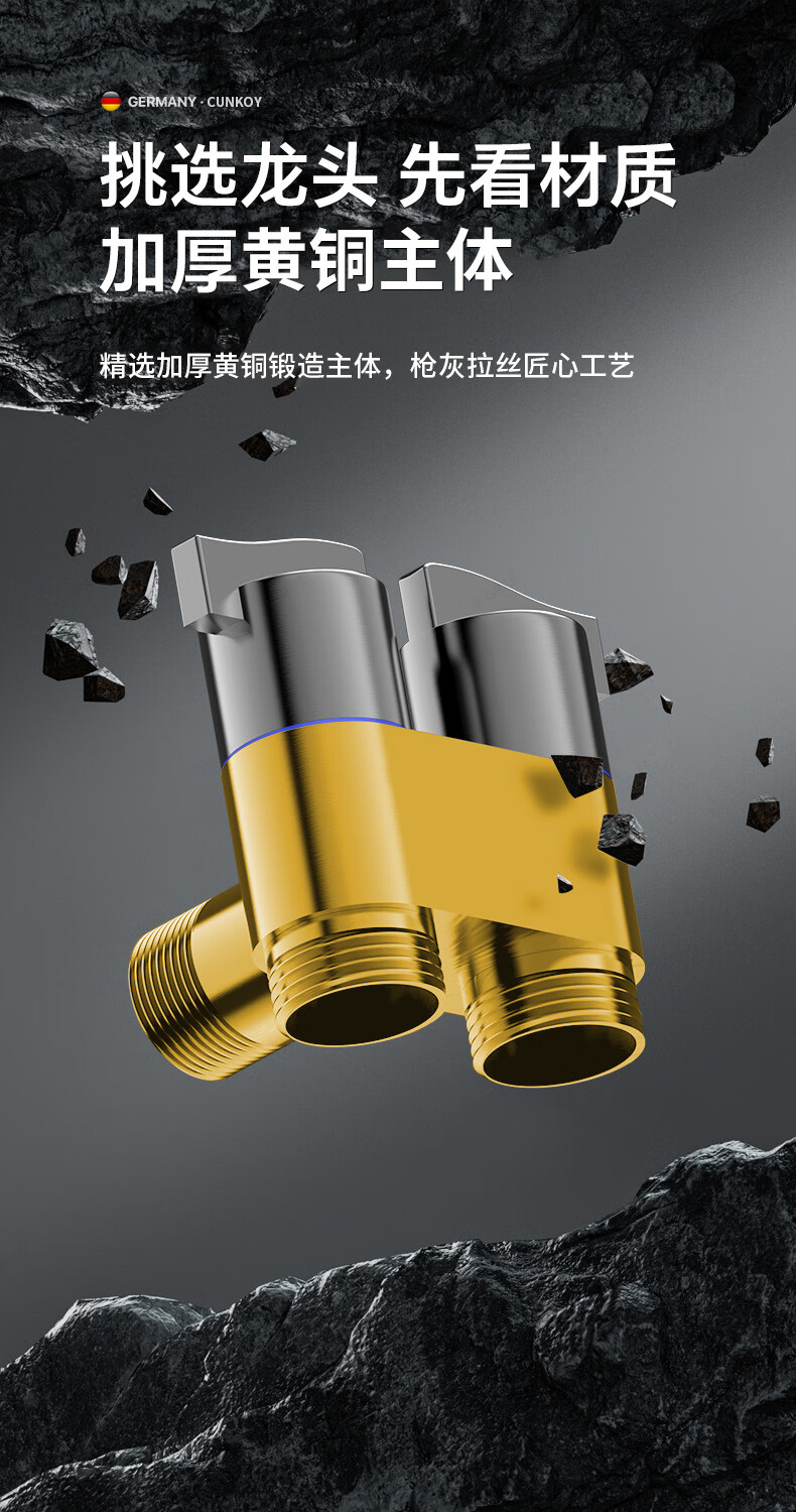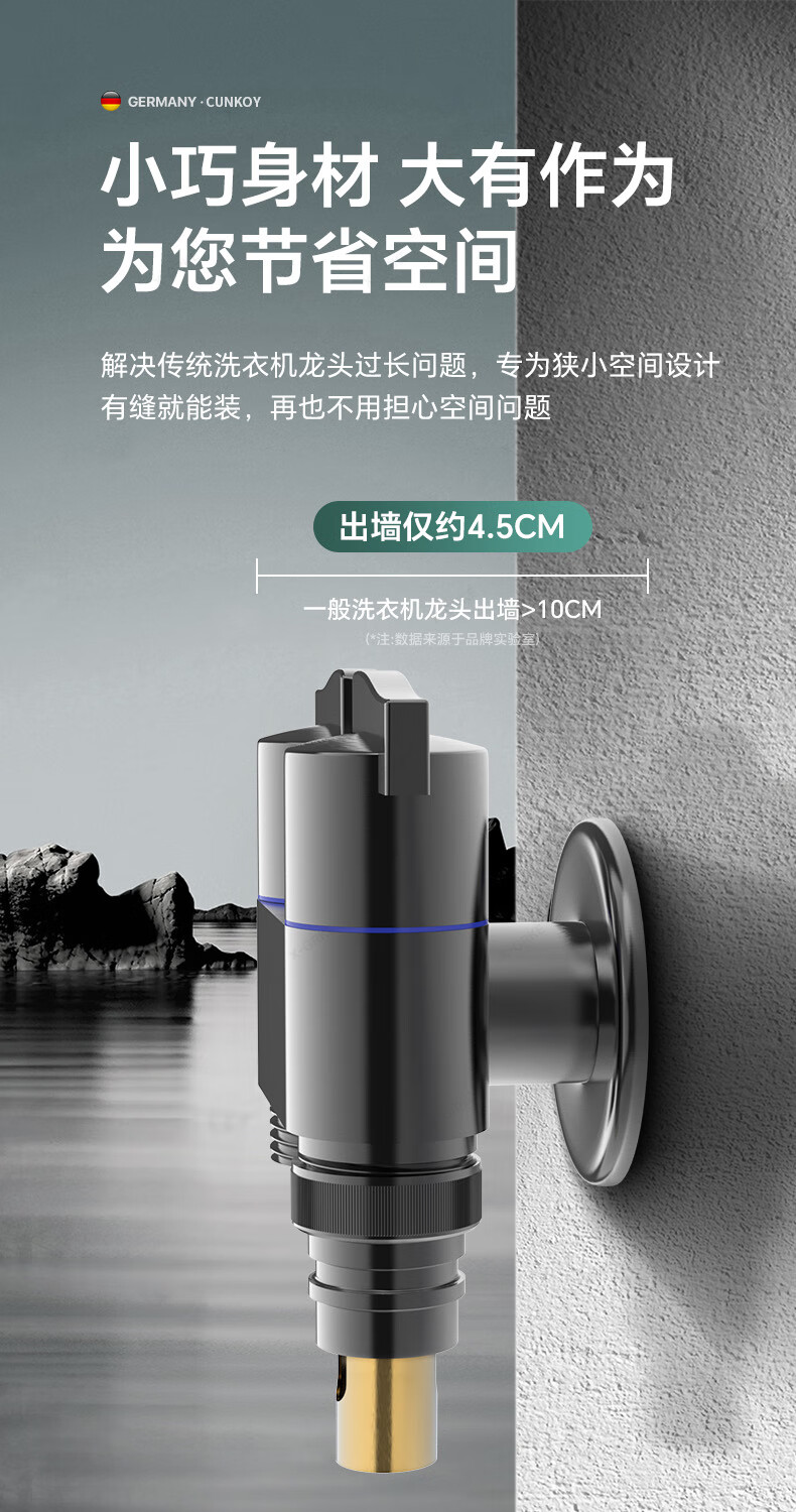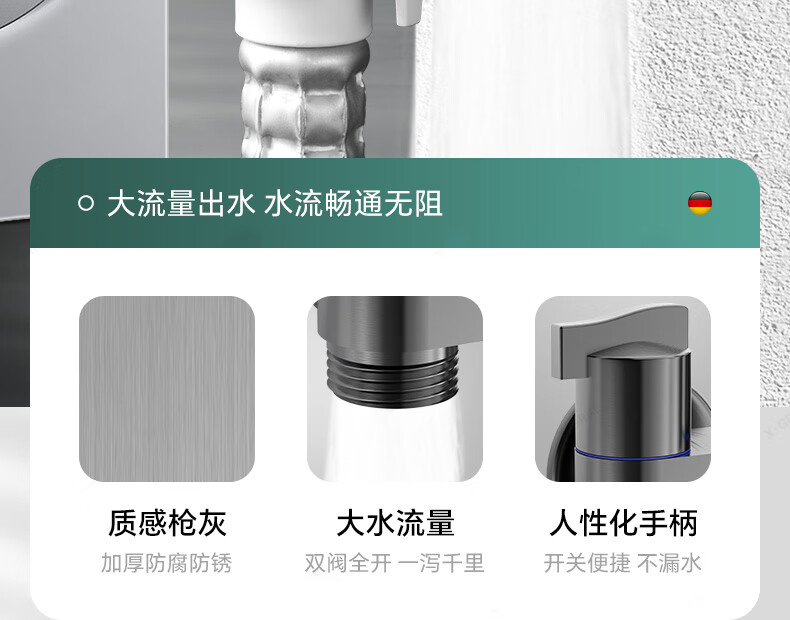 CUNKOY【德国】洗衣机水龙头全铜主体角阀4分接口专用防脱落自动止水阀 双出水洗衣机龙头【全铜主体】枪灰 4分通用接口丨脱管自动止水
