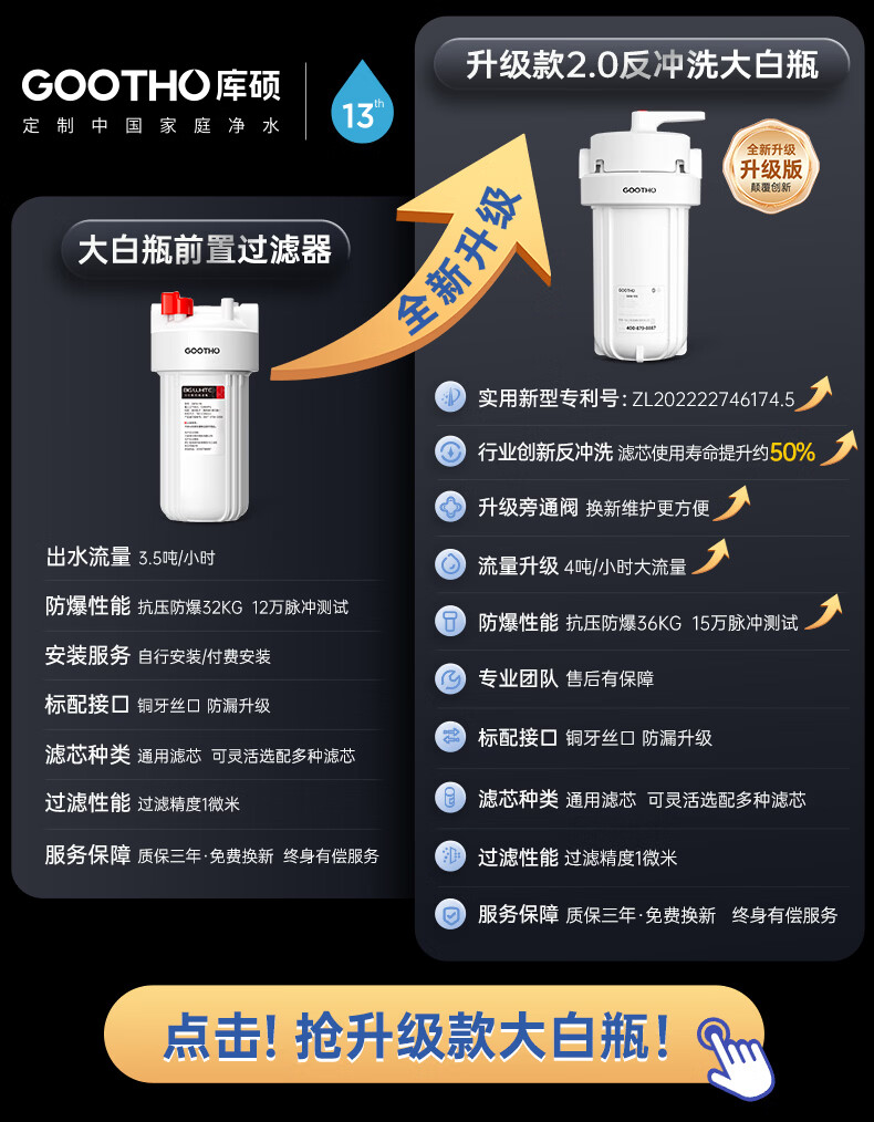 GOOTHO大白瓶前置过滤器 全屋家用自来水过滤净水器大通量大蓝瓶中央过滤通用滤芯除余氯阻垢 10寸单联基础过滤【1微米PP棉】