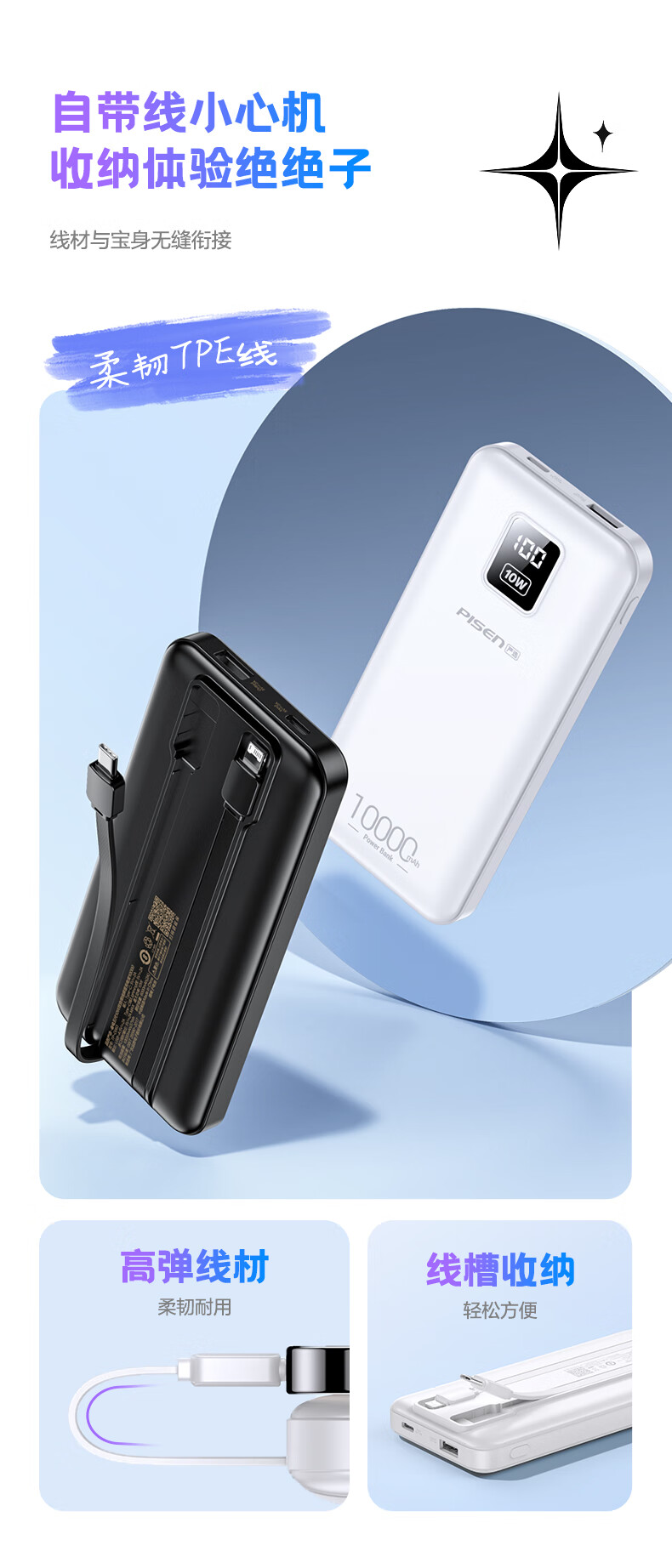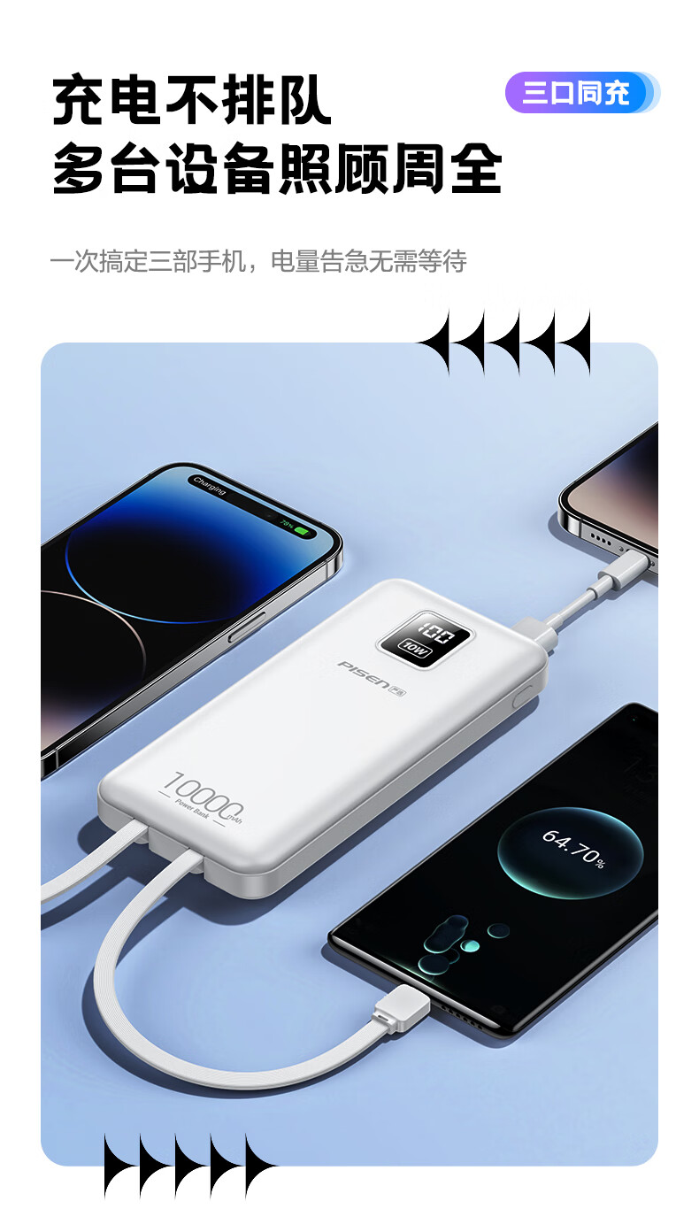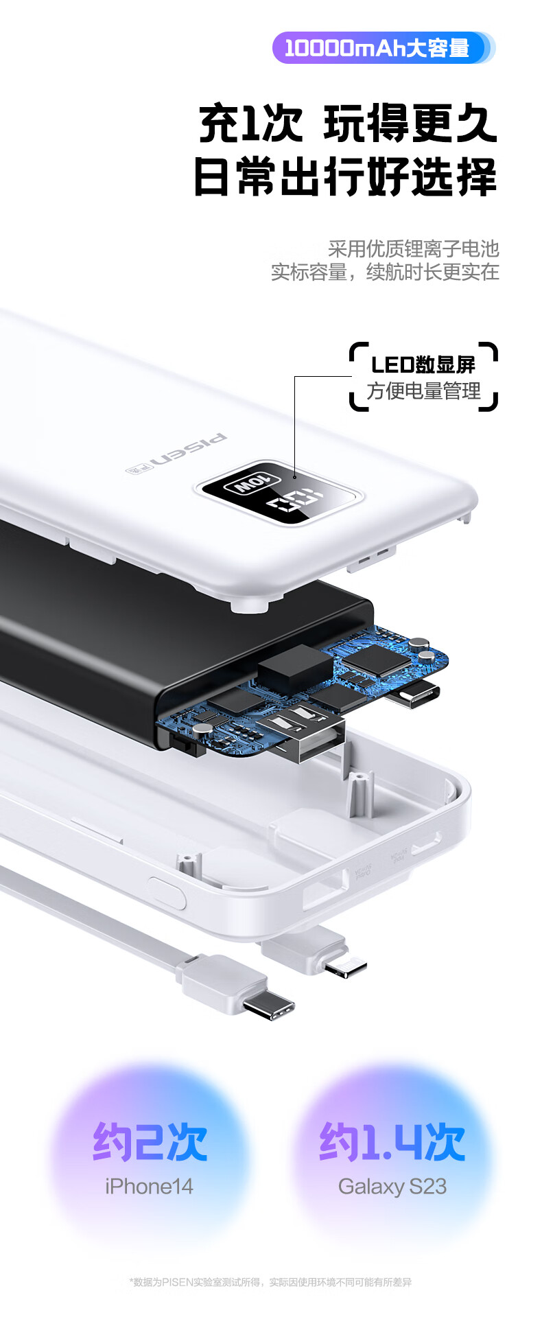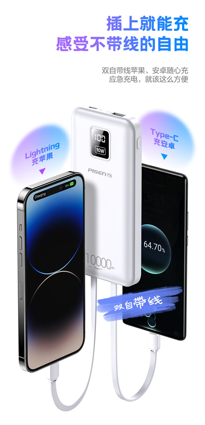 品胜(PISEN)【3C认证可上飞机】10W双自带线 屏显充电宝10000mAh大容量充电宝便携宿舍移动电源苹果小米华为 白色【1万毫安|屏显|自带线】