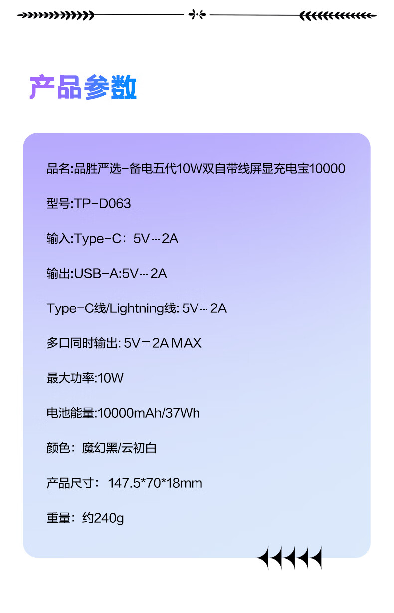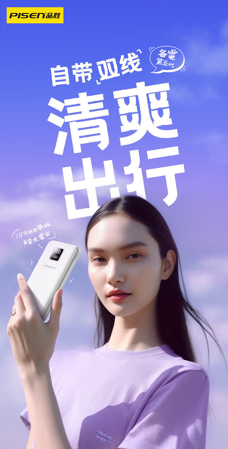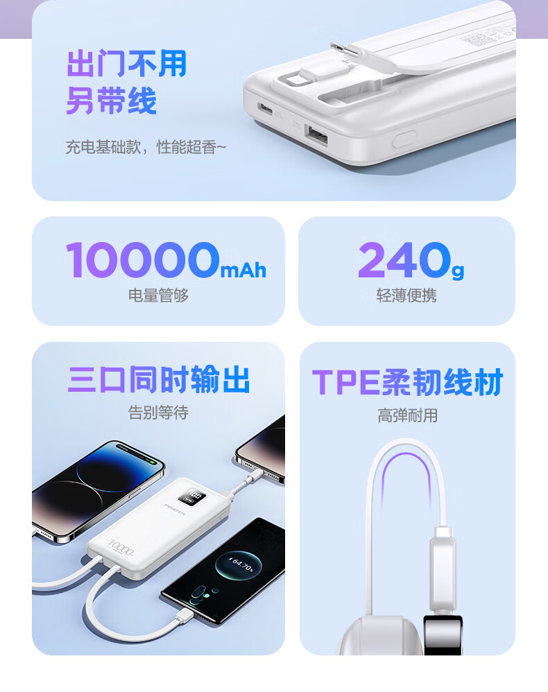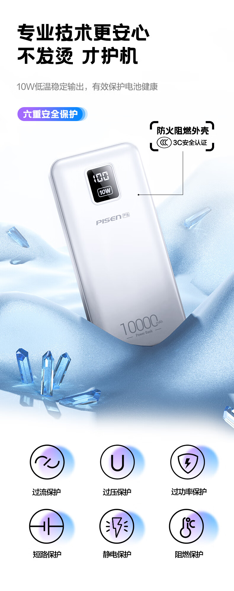 品胜(PISEN)【3C认证可上飞机】10W双自带线 屏显充电宝10000mAh大容量充电宝便携宿舍移动电源苹果小米华为 白色【1万毫安|屏显|自带线】