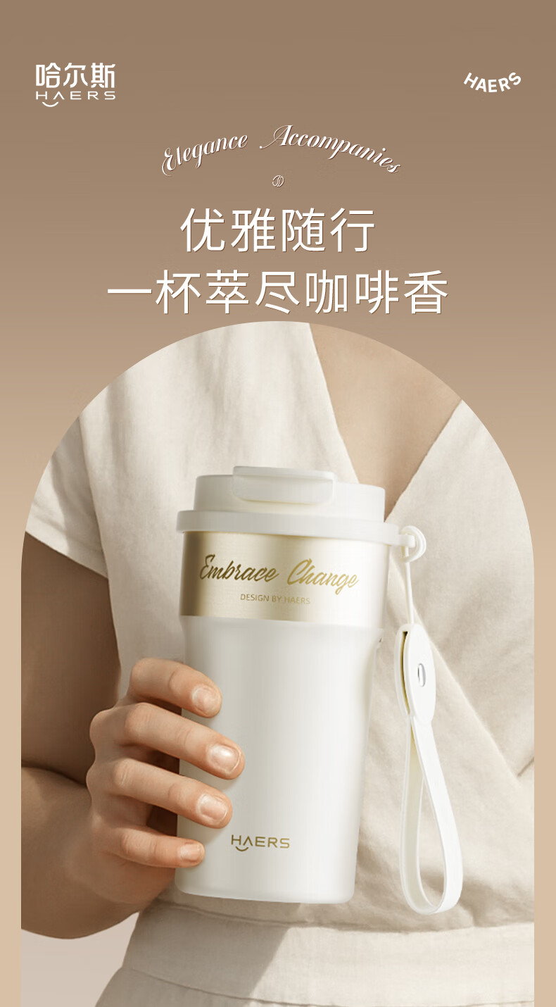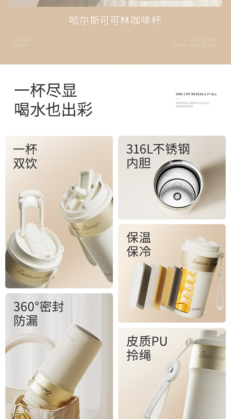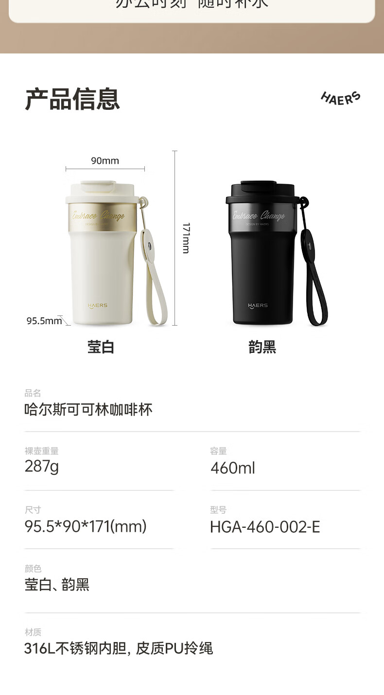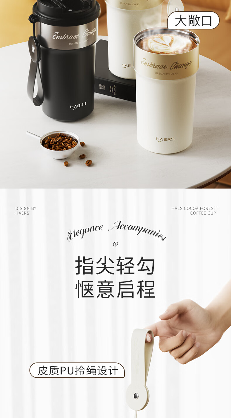 哈尔斯咖啡保温杯316不锈钢吸管杯男女士外出便携式保冷水杯车载适用 莹白460ml【赠皮质提绳】