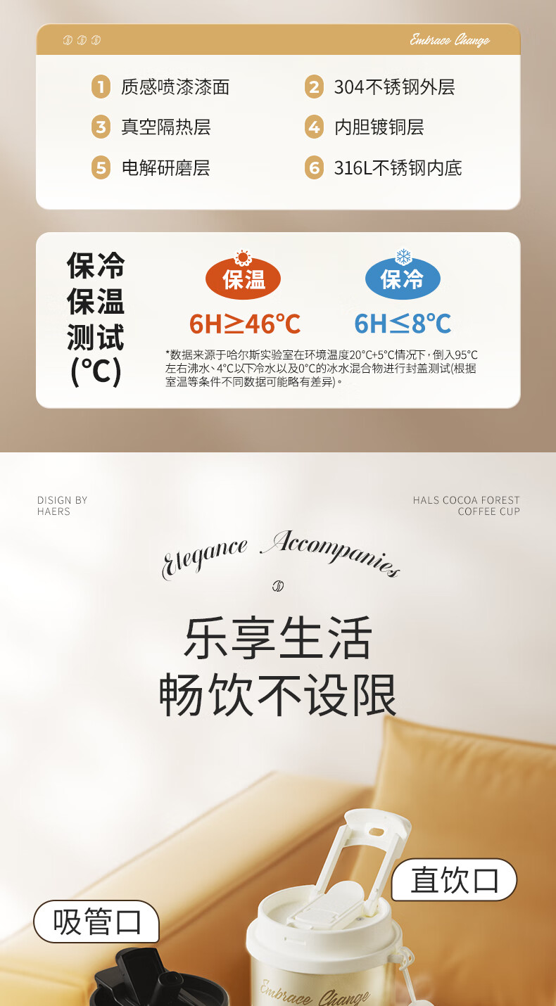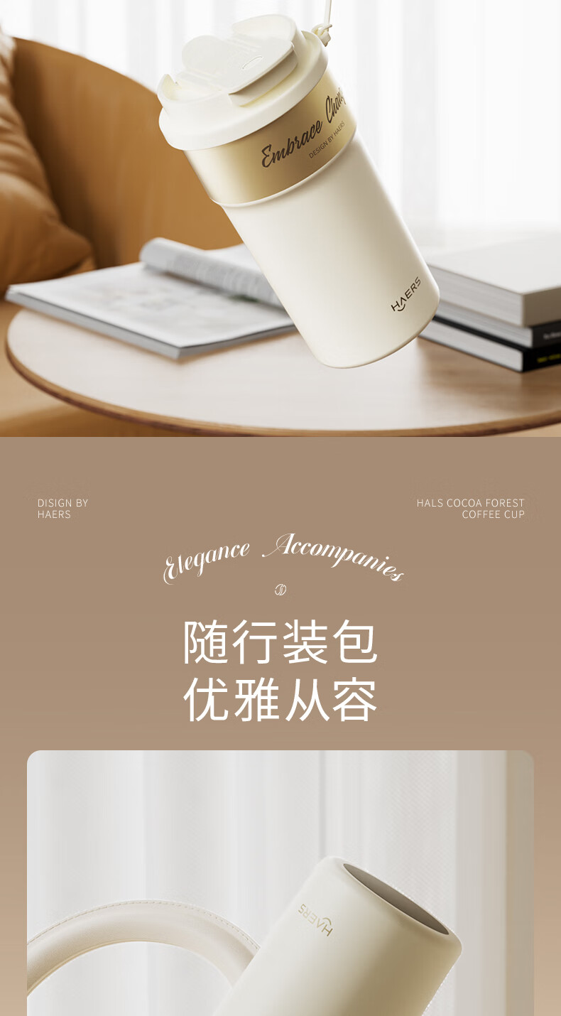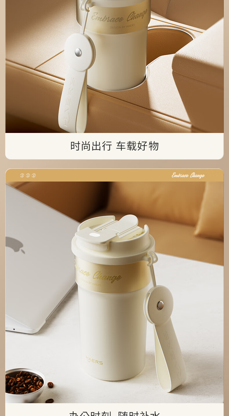 哈尔斯咖啡保温杯316不锈钢吸管杯男女士外出便携式保冷水杯车载适用 莹白460ml【赠皮质提绳】