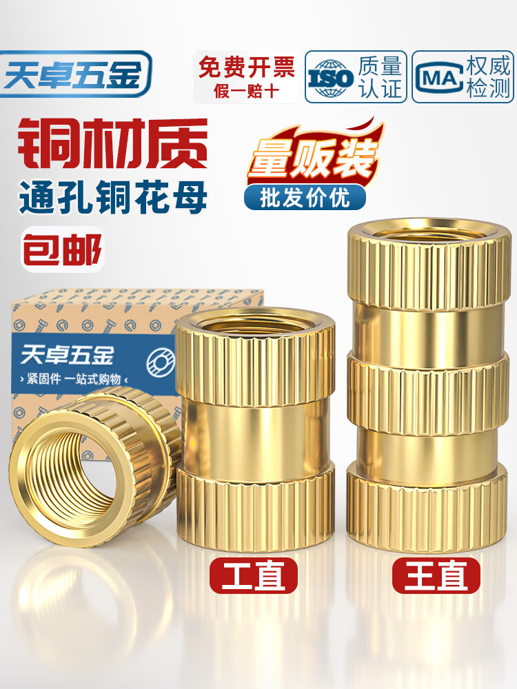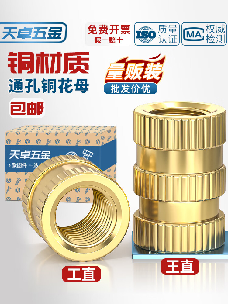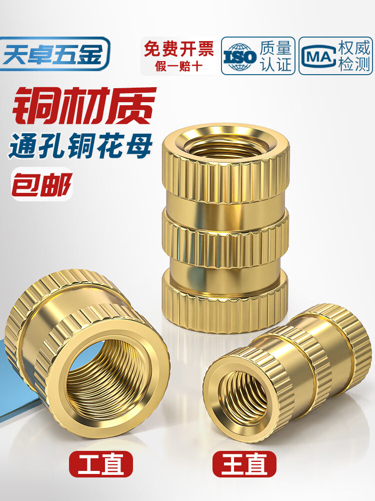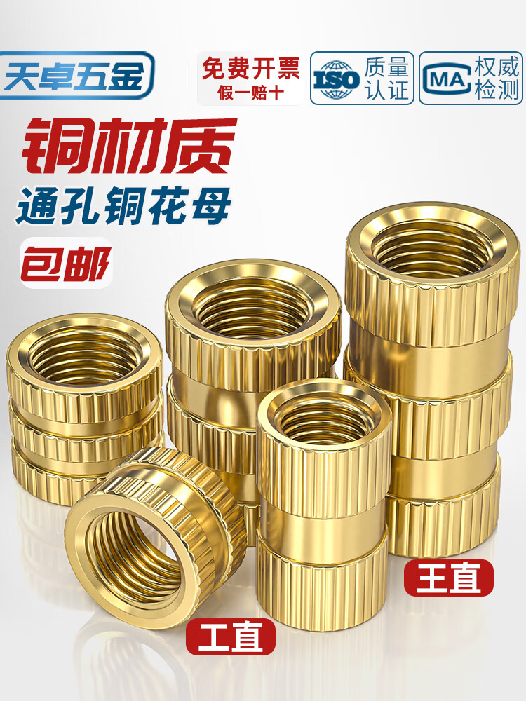 天卓五金通孔注塑热熔铜螺母滚花螺母铜镶件预埋螺帽铜花螺母M2M3M4M5M6M8 M3*6*4.5【工直】-150个