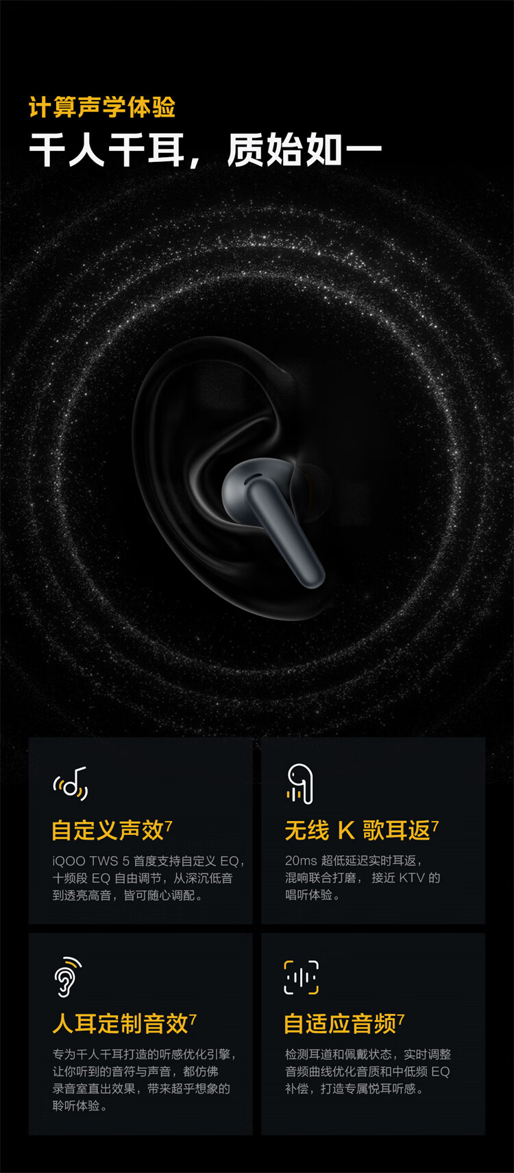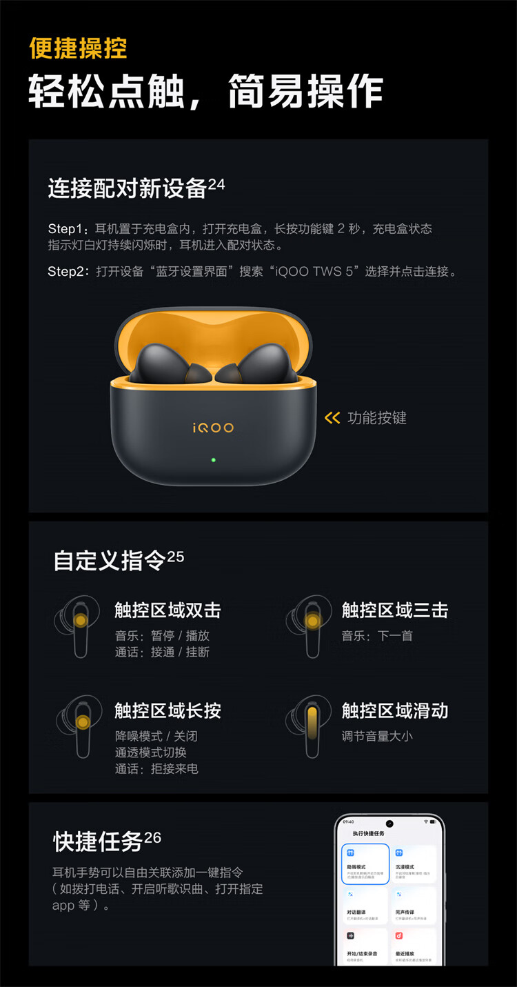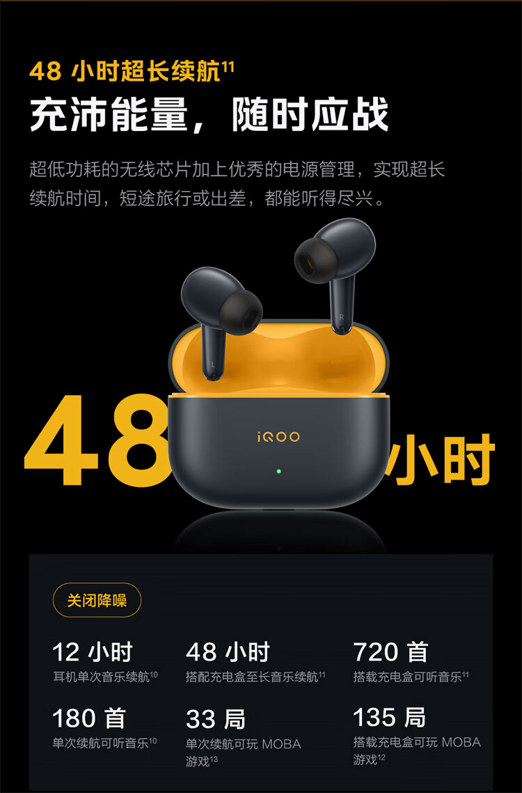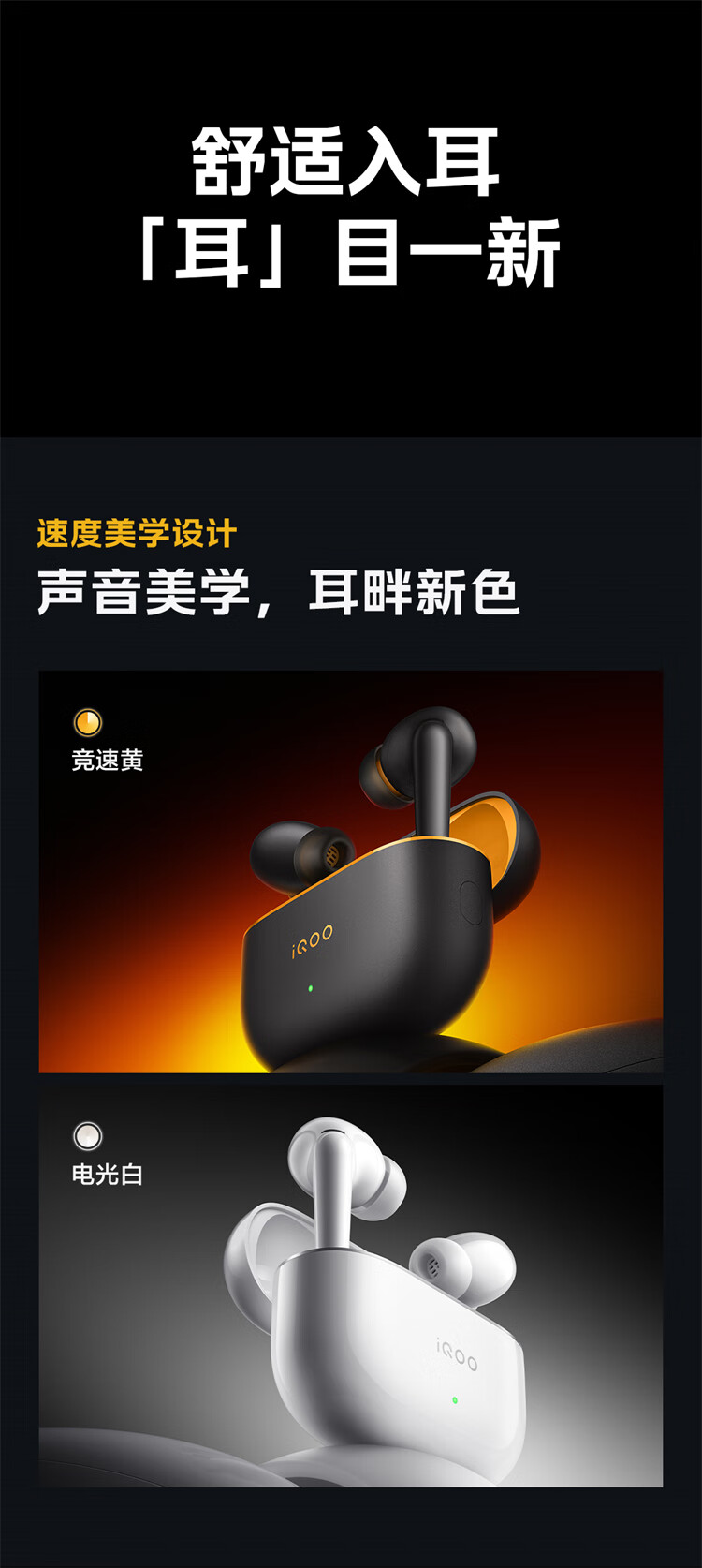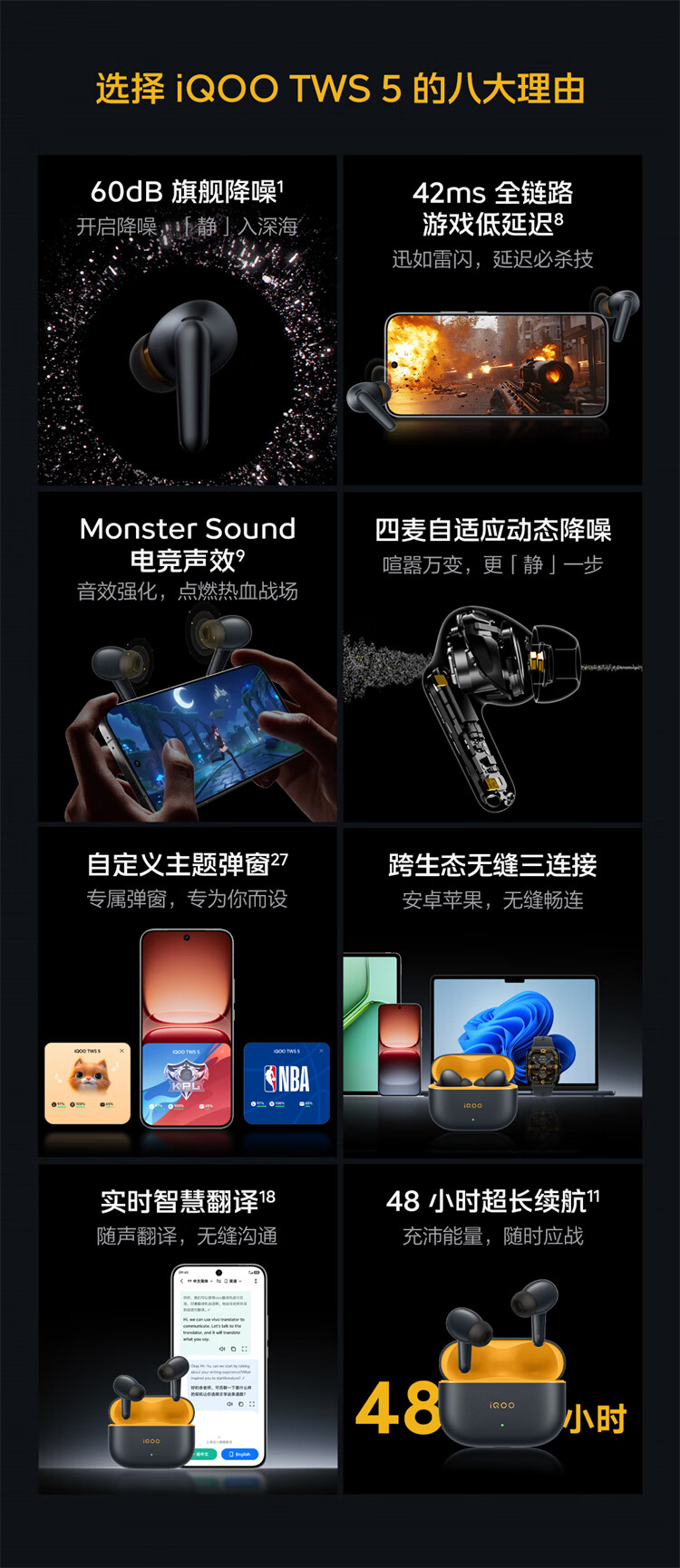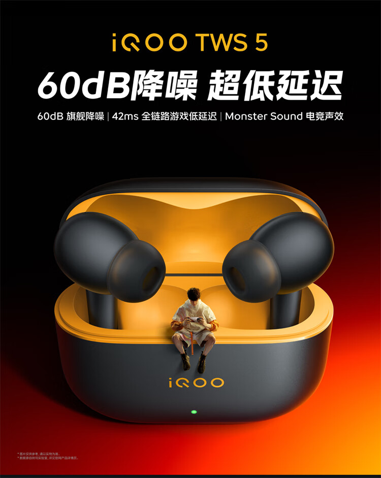 vivo iQOO TWS 5 竞速黄 国家补贴60dB旗舰降噪 42ms全链路游戏低延迟 Monster Sound电竞声效