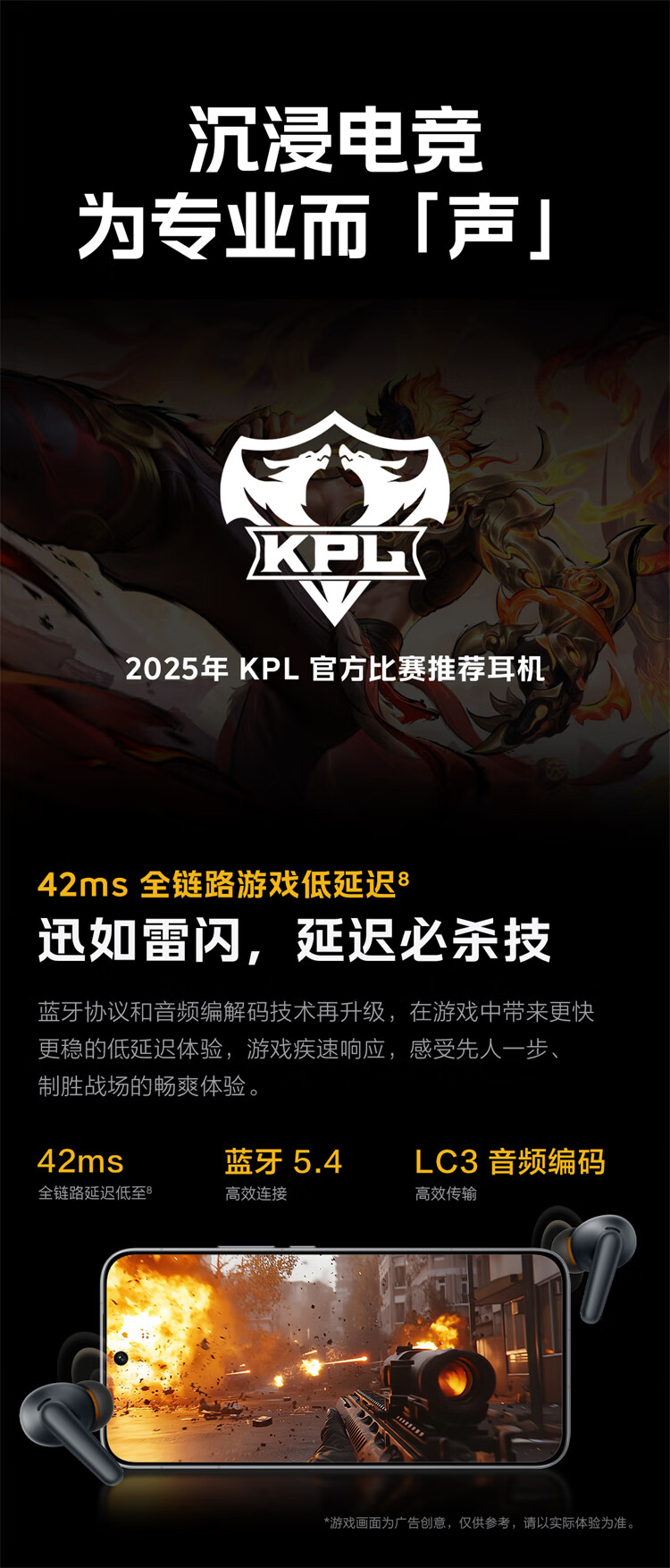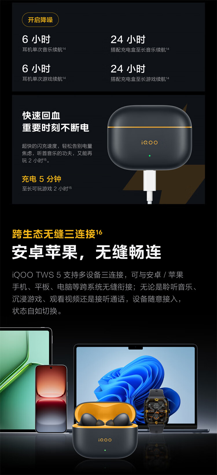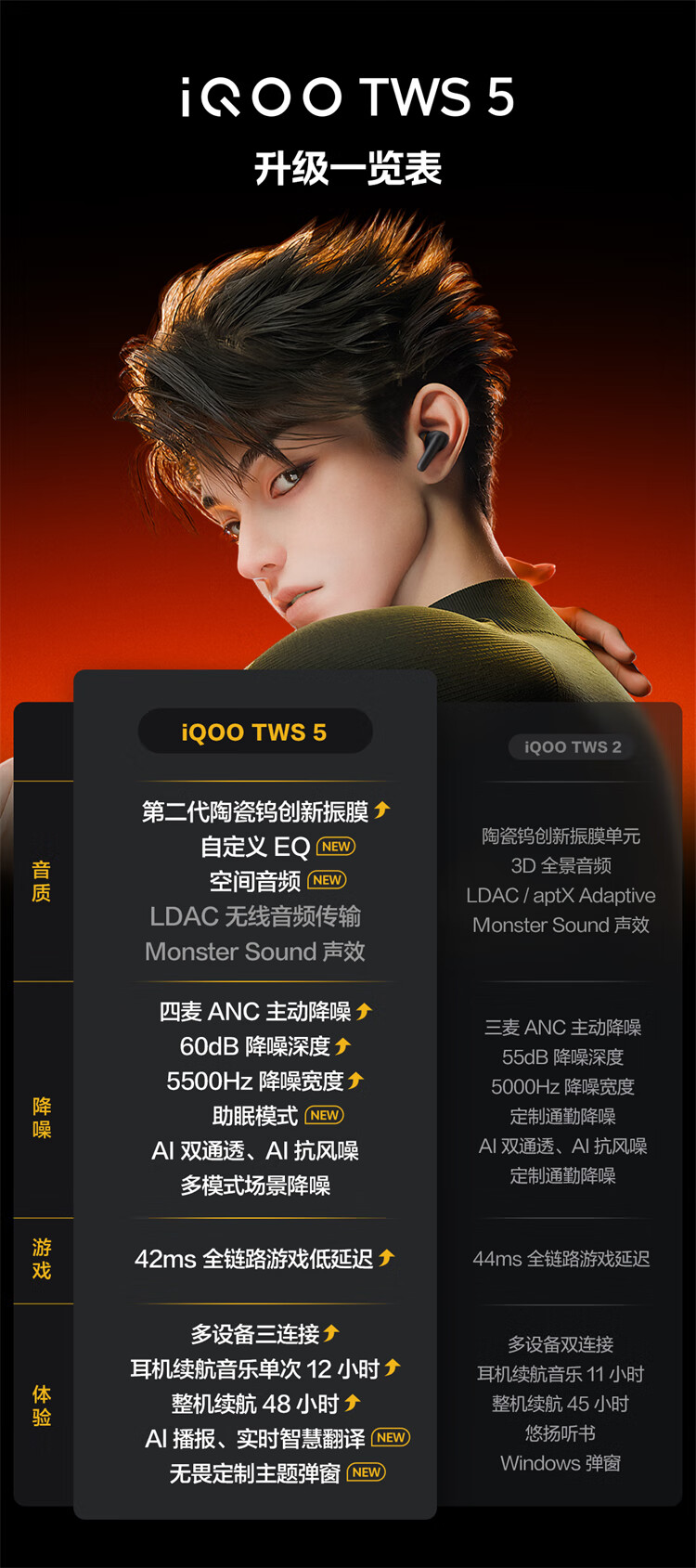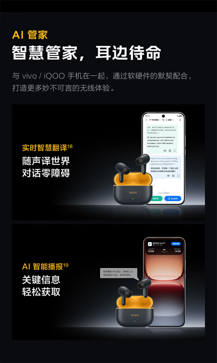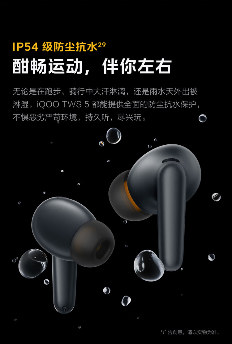 vivo iQOO TWS 5 竞速黄 国家补贴60dB旗舰降噪 42ms全链路游戏低延迟 Monster Sound电竞声效