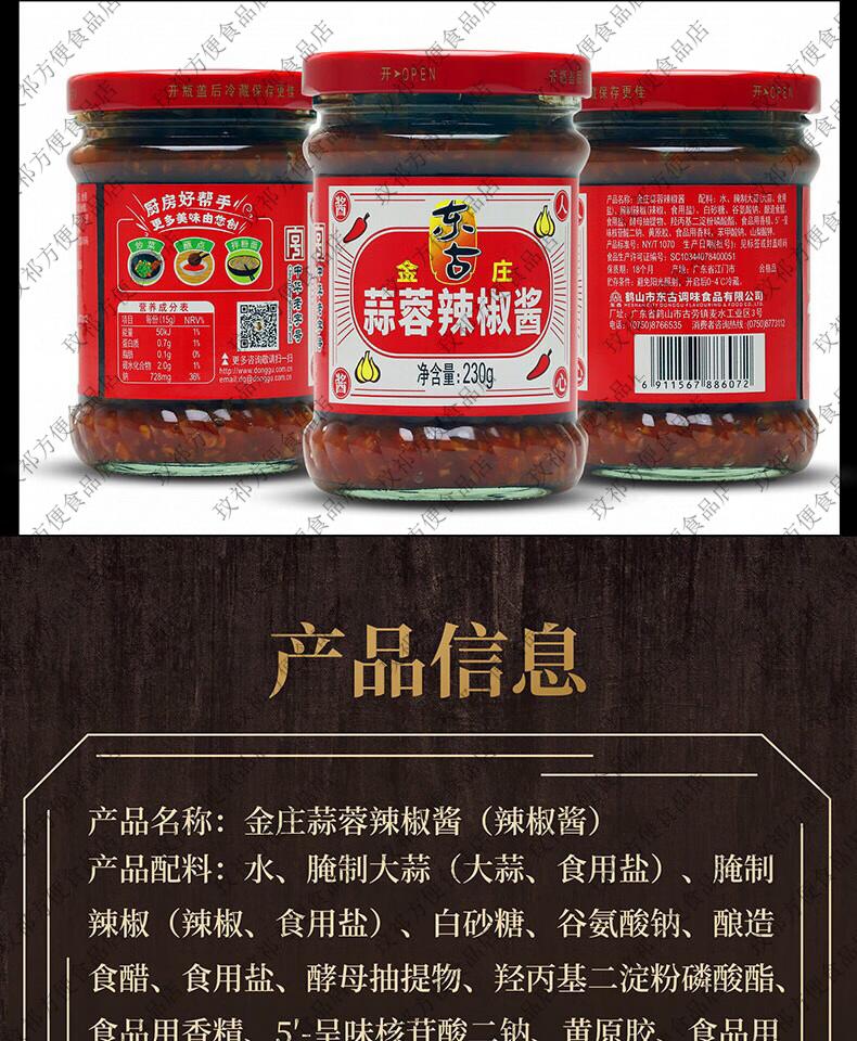 东古蒜蓉辣椒酱金庄蒜蓉辣酱鹤山香格辣拌饭酱调味火锅蘸料230g 经典蒜蓉辣椒酱230gX一瓶