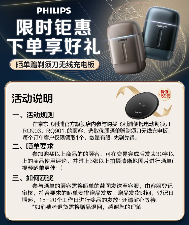 飞利浦(PHILIPS)电动剃须刀新一代旋护式鹅卵石Pro 无线充电便携款剃须刀暮霭金 生日礼物送男生男友老公父亲